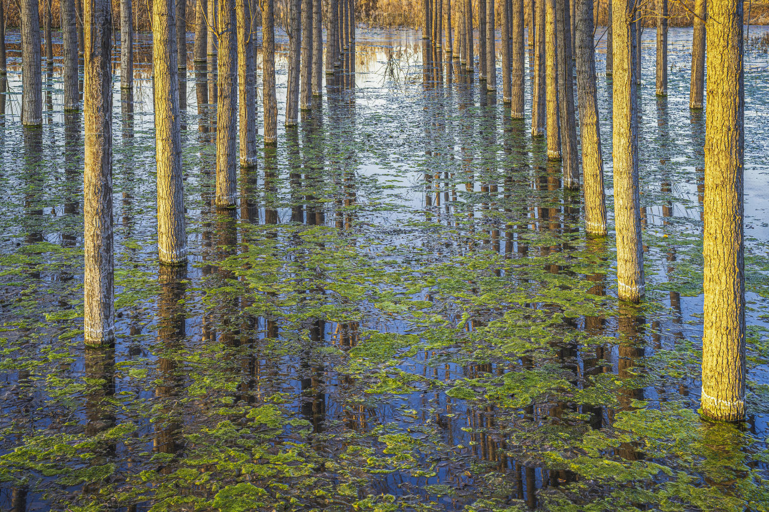 夕陽下被長滿水草的雨水長期浸泡的樹林