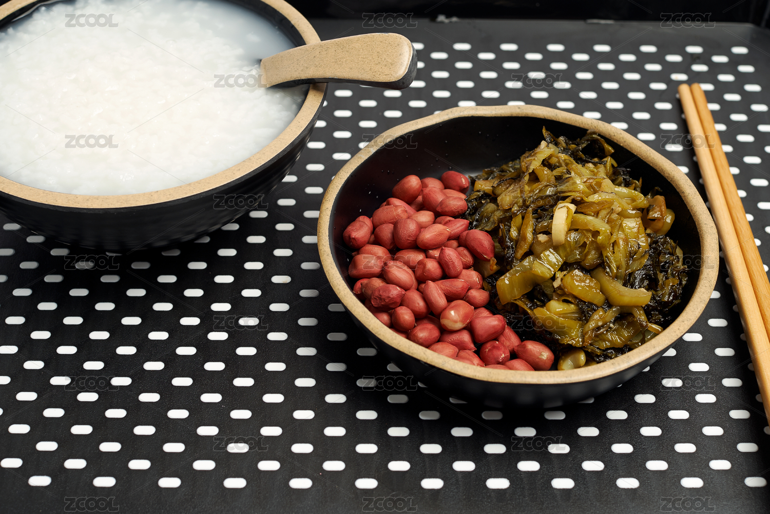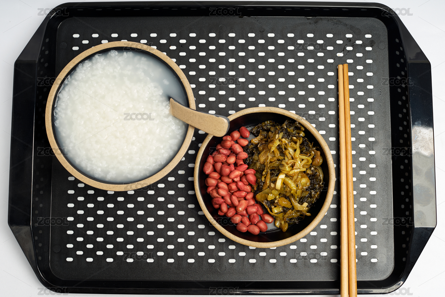 黑色托盤上的廣東風味小食一碗白粥和一碟花生咸菜