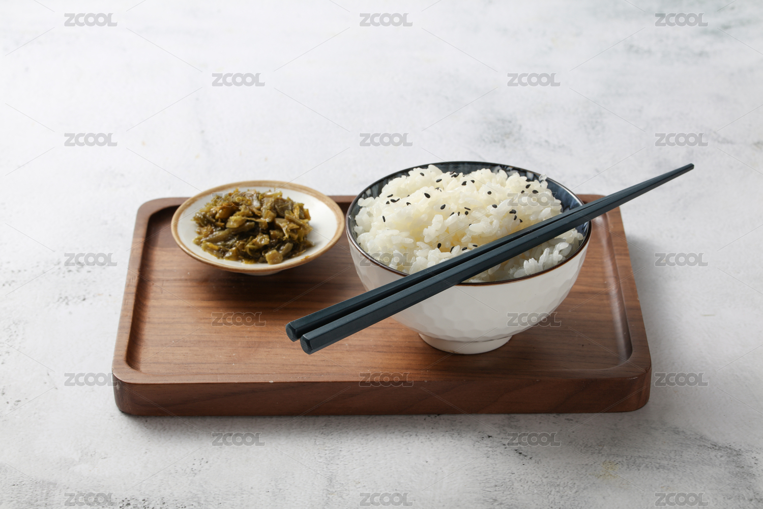 撒黑芝麻的米飯與咸菜木托盤套餐