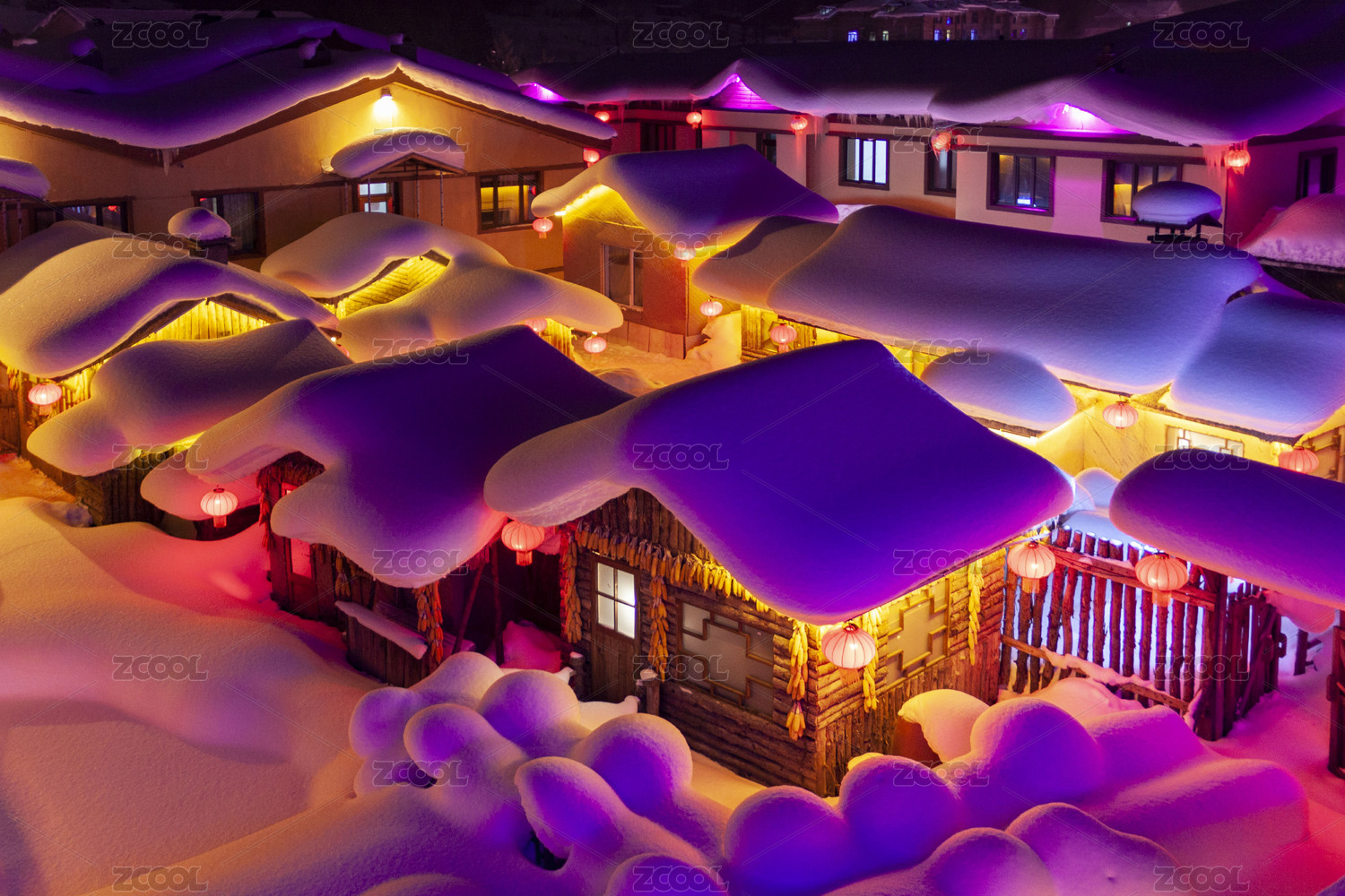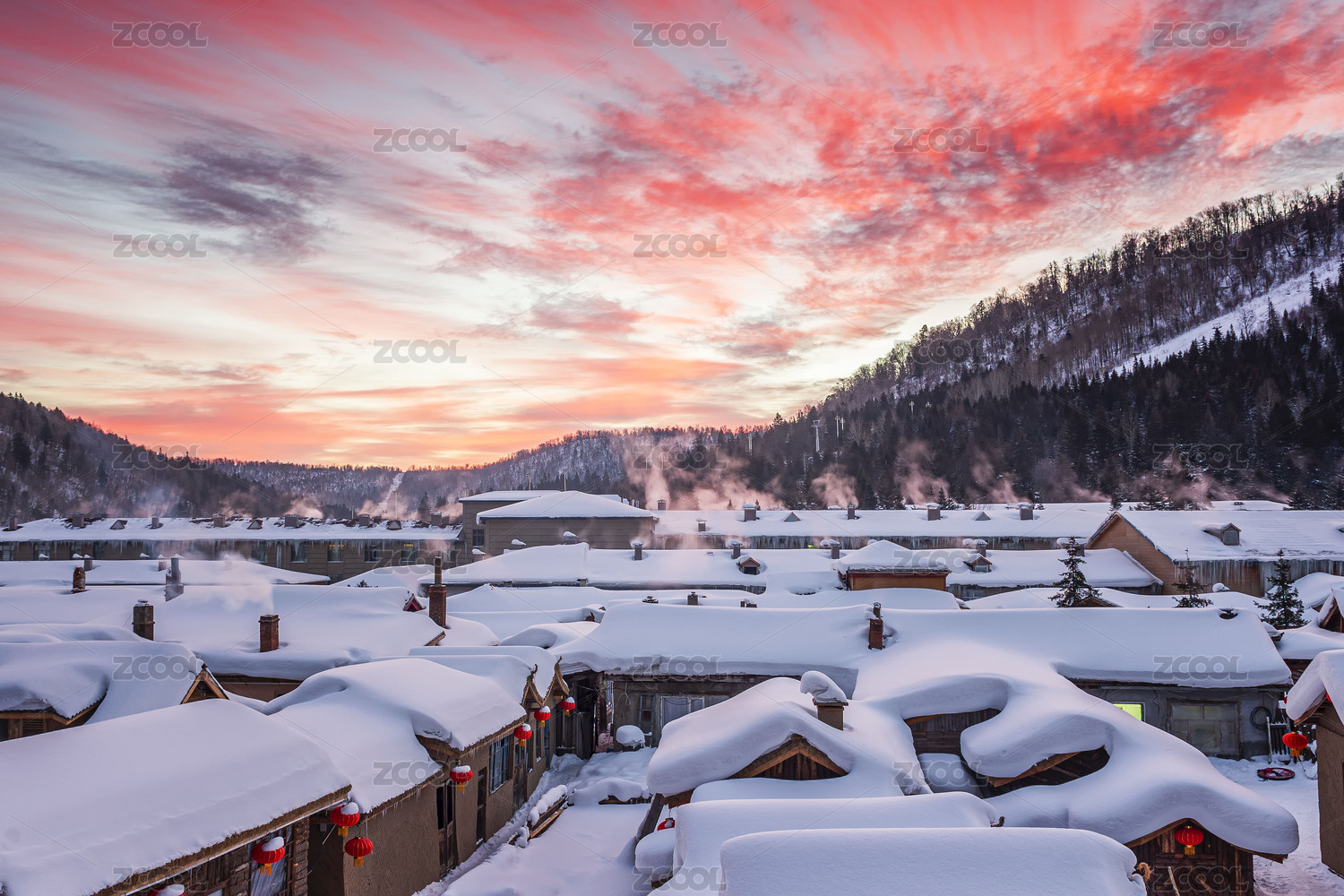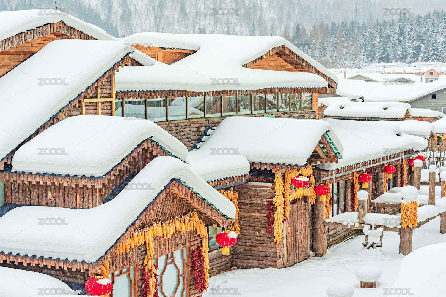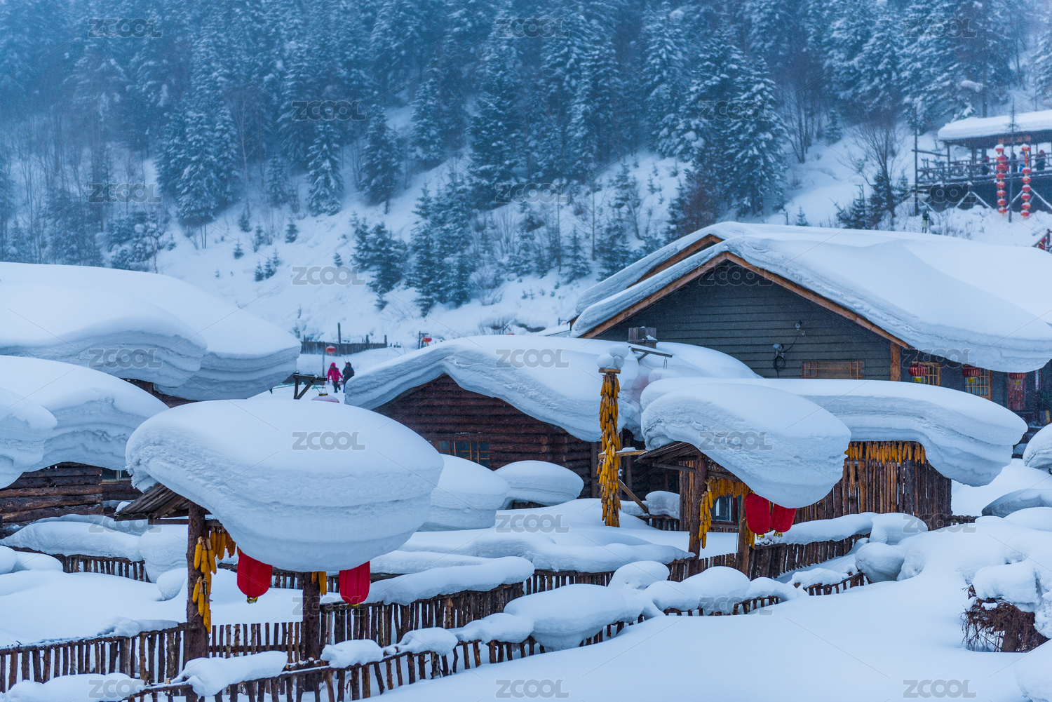 中國(guó)黑龍江雪鄉(xiāng)紅燈籠木屋雪景