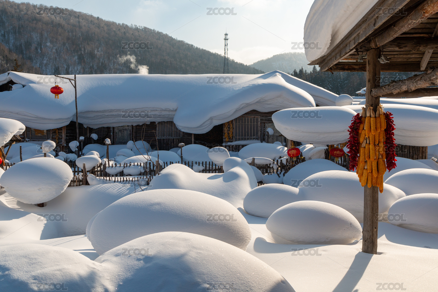中國(guó)東北雪鄉(xiāng)冬季積雪的小木屋
