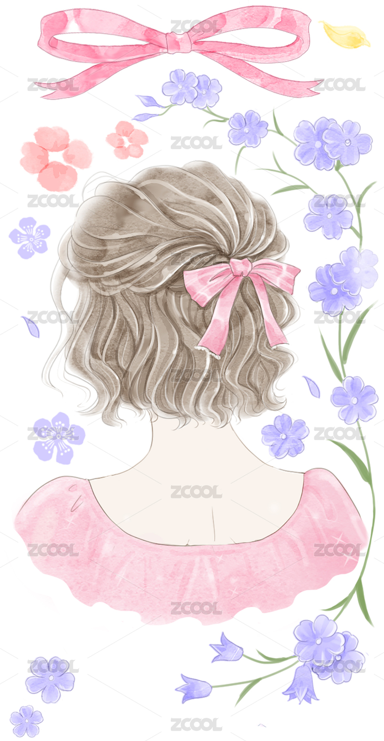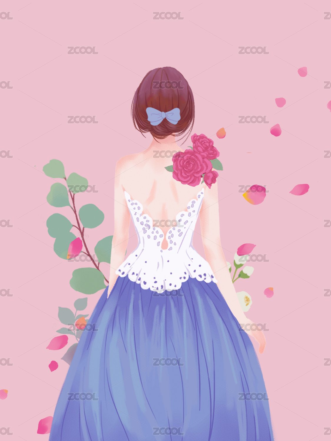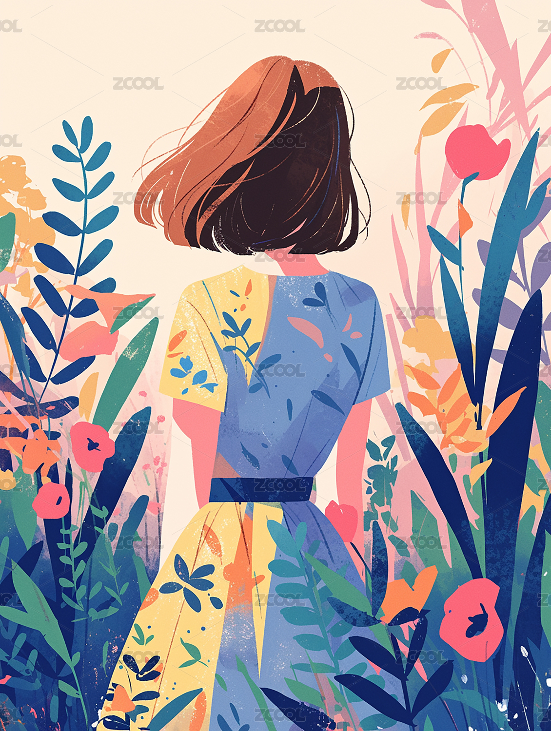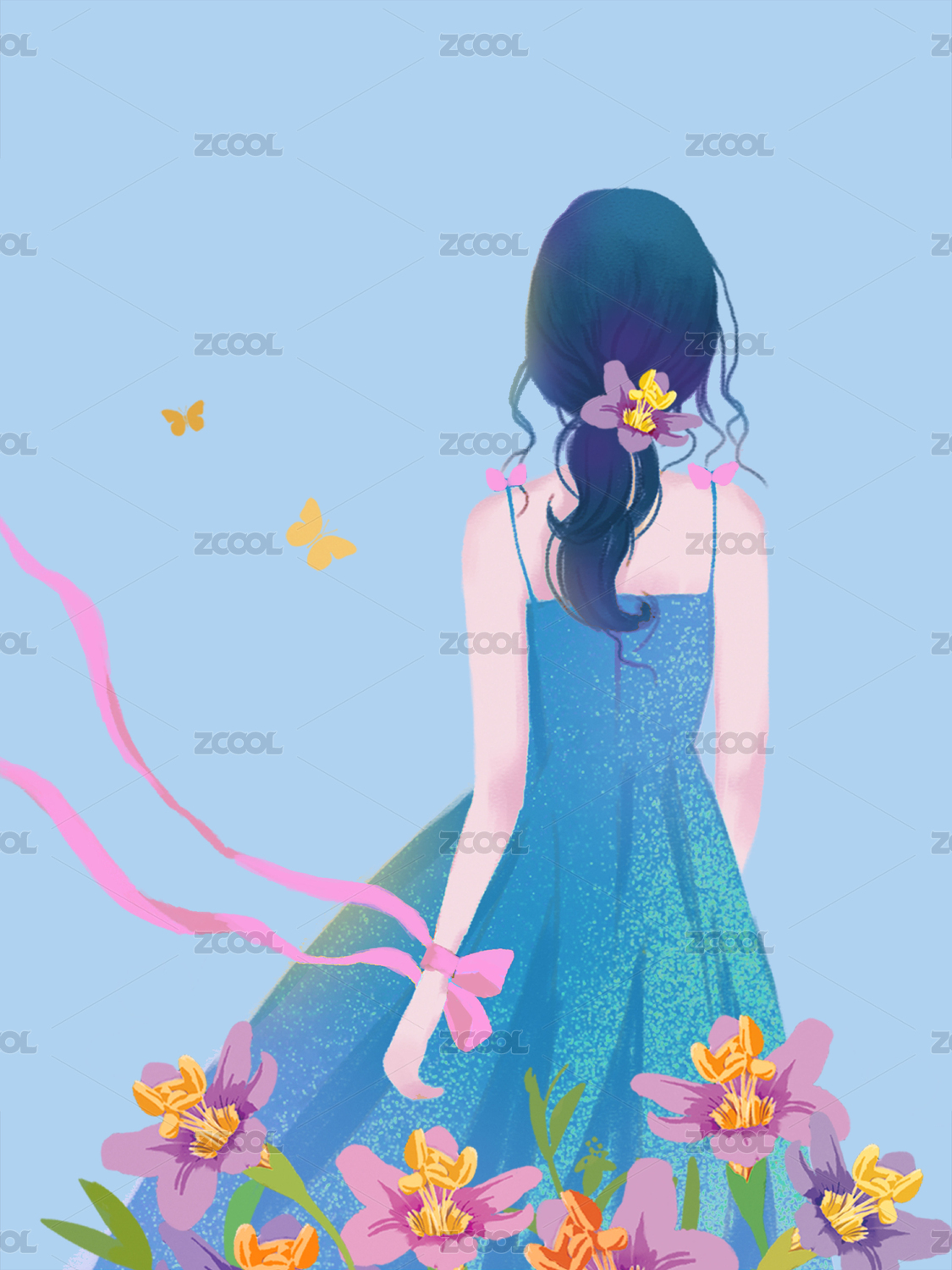 手繪初夏美女背影插畫