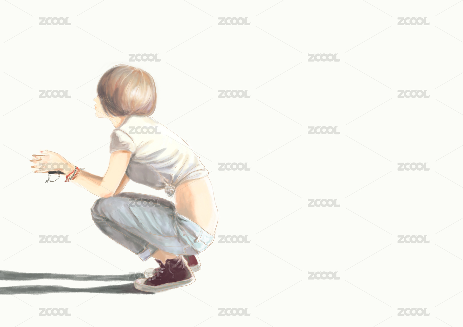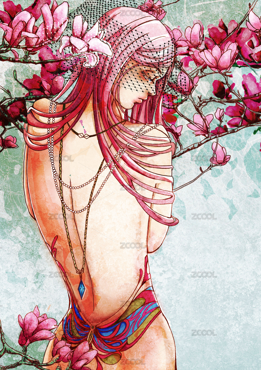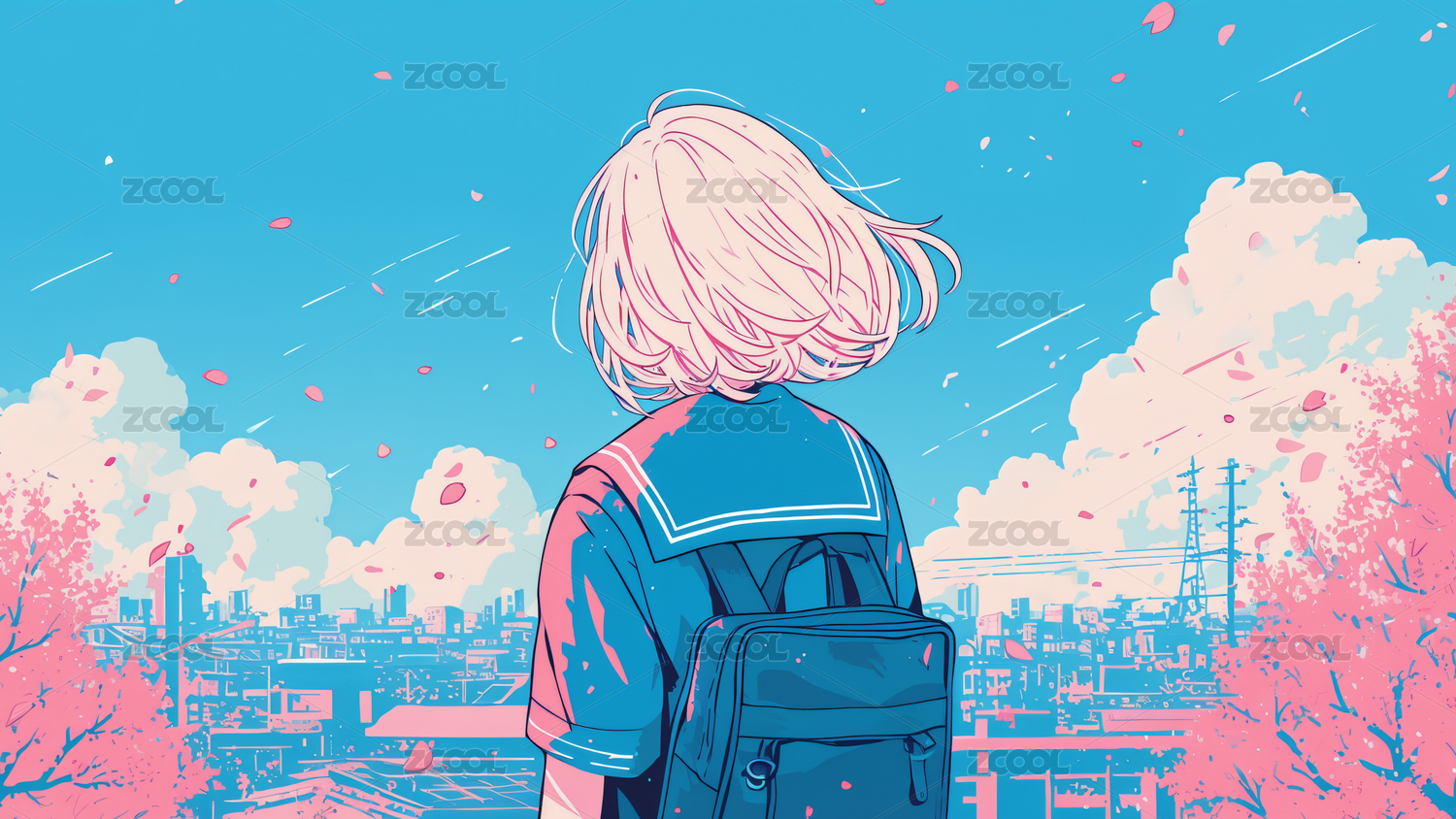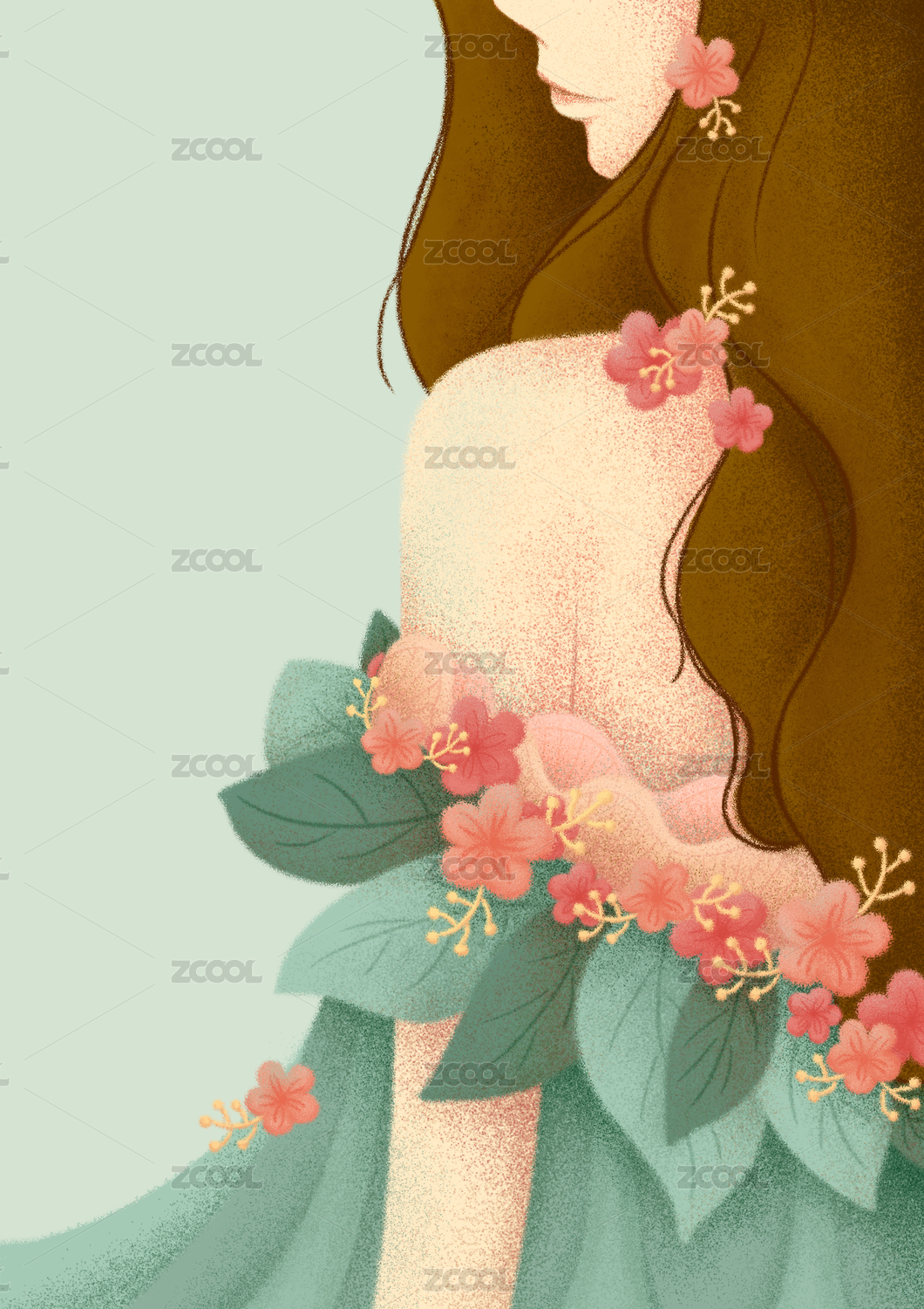 手繪初夏美女背影插畫