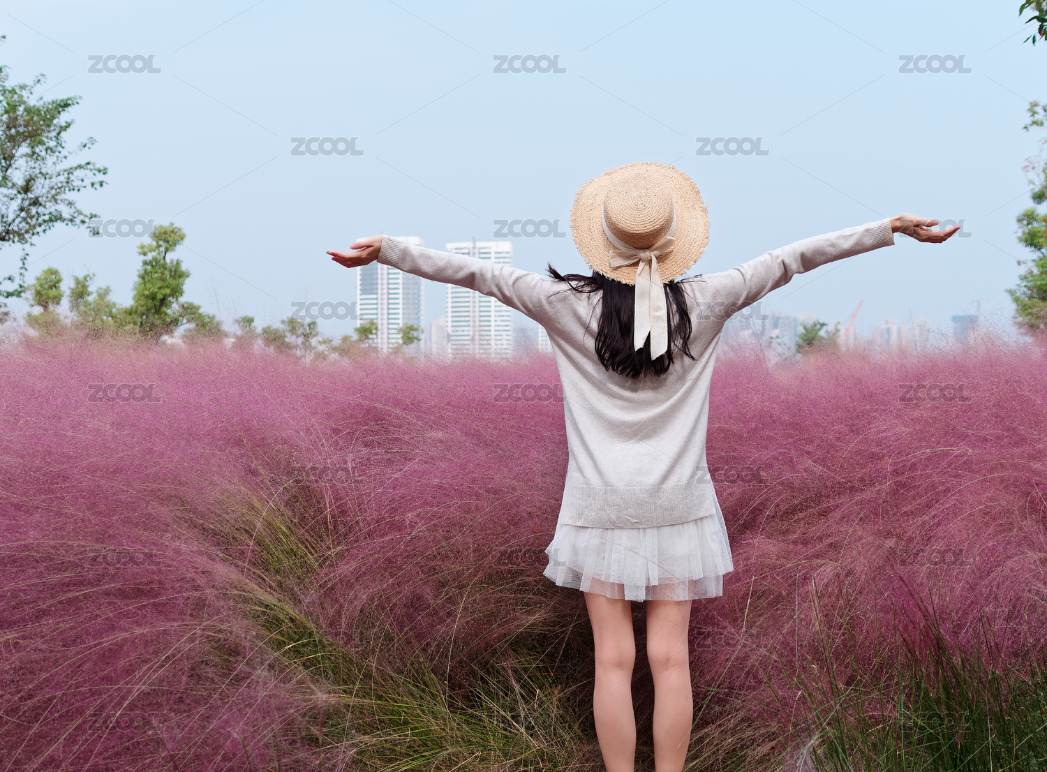 粉黛亂子草前帶著草帽的年輕中國女人背影