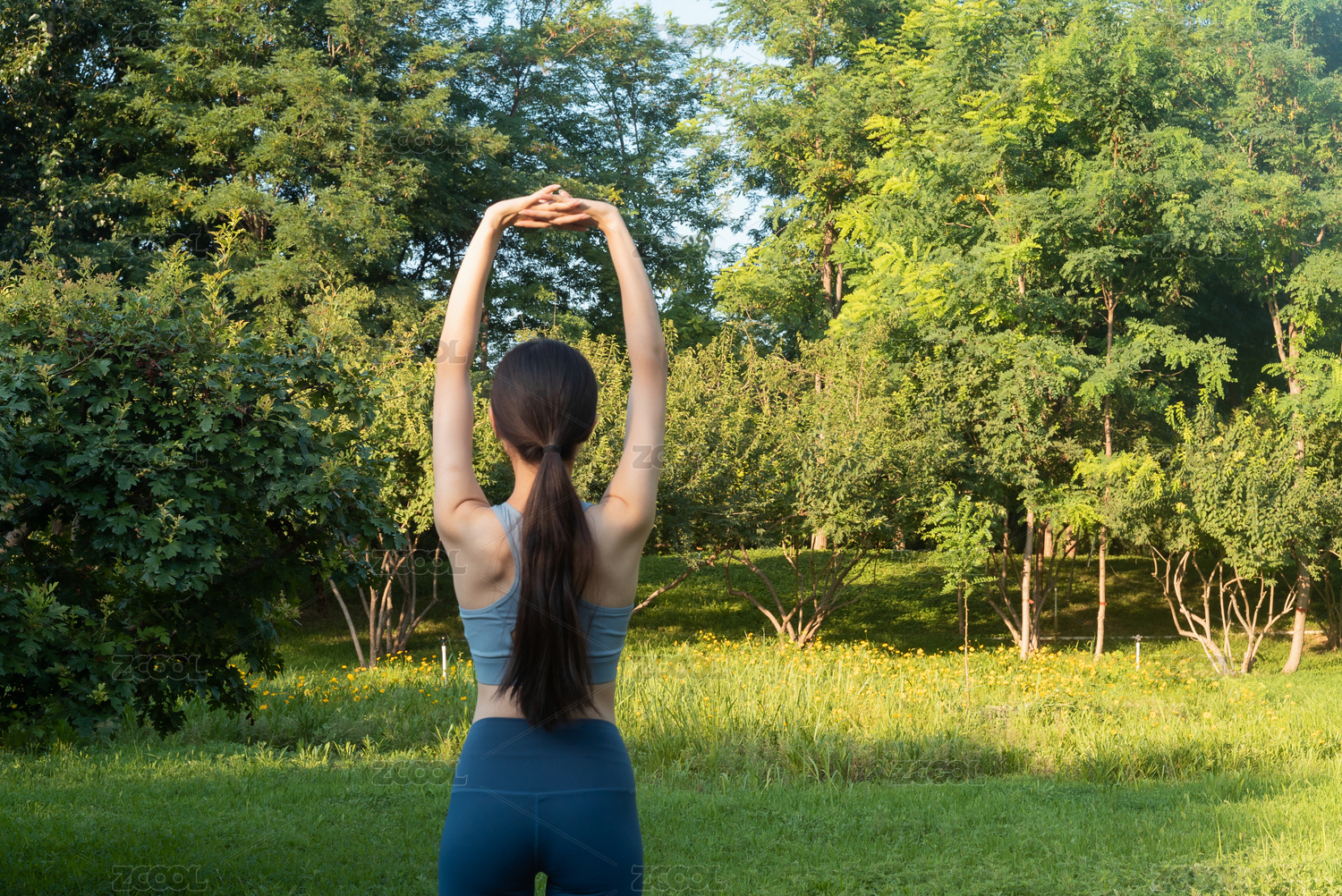 有陽光的公園里,正在鍛煉的年輕女性背影