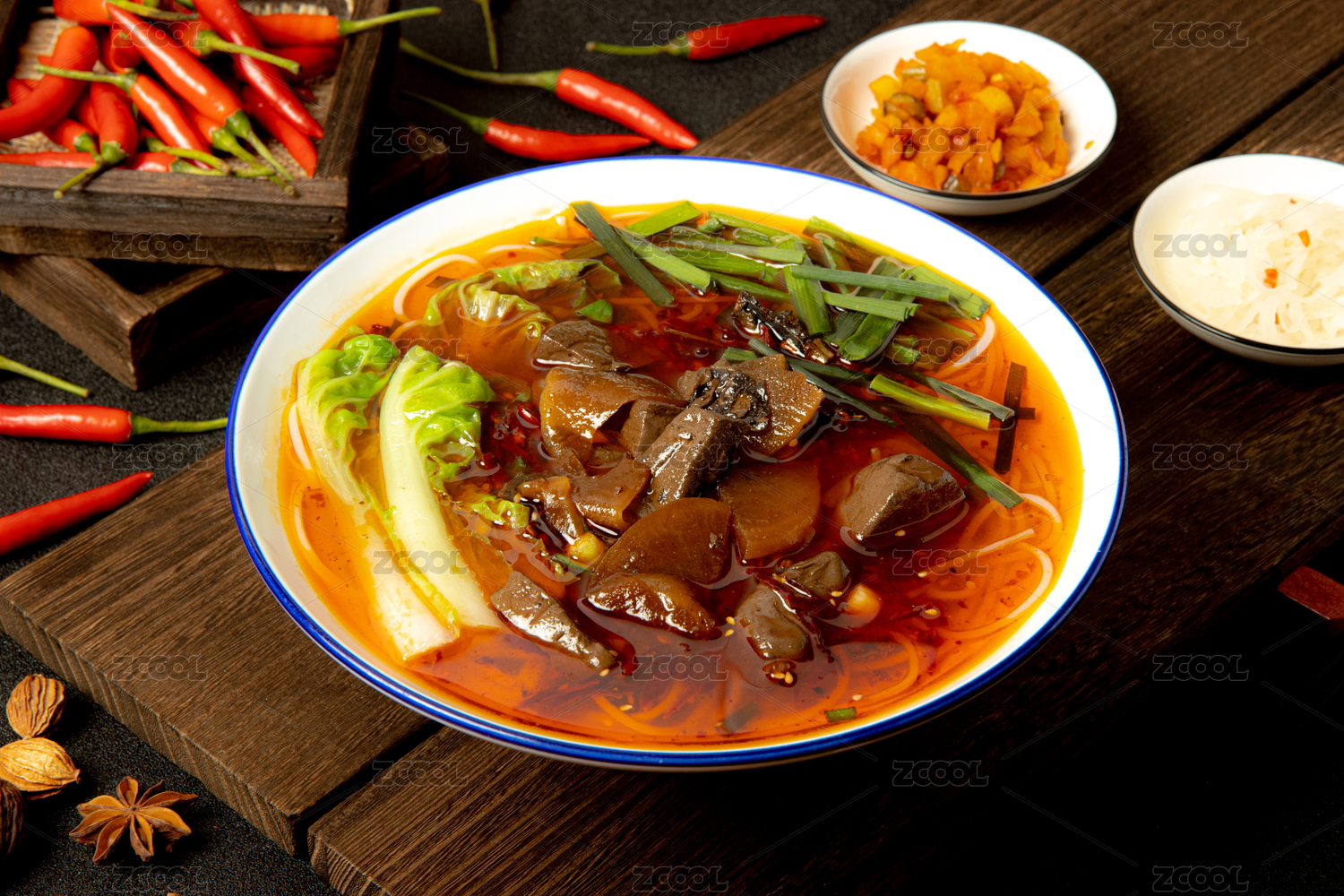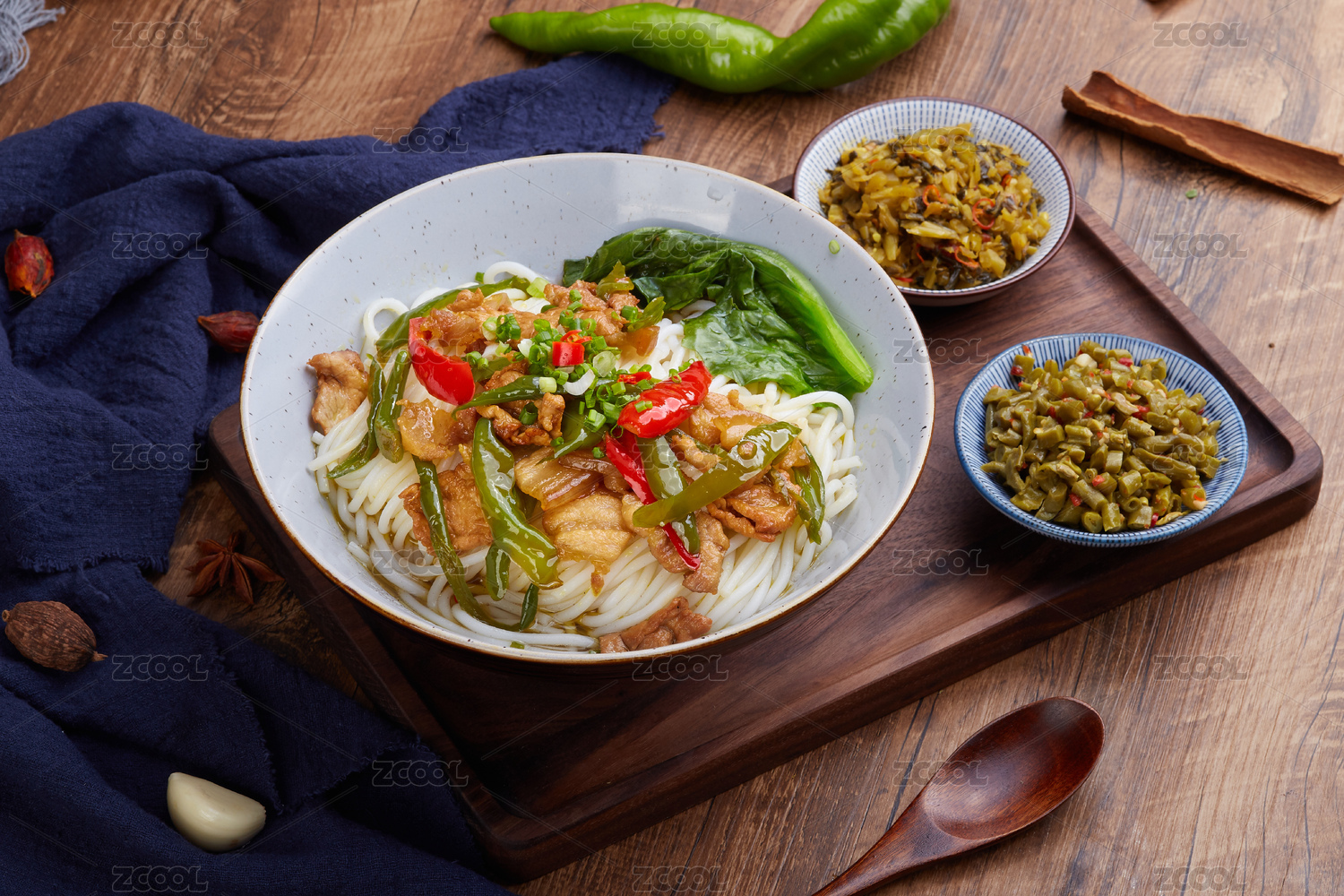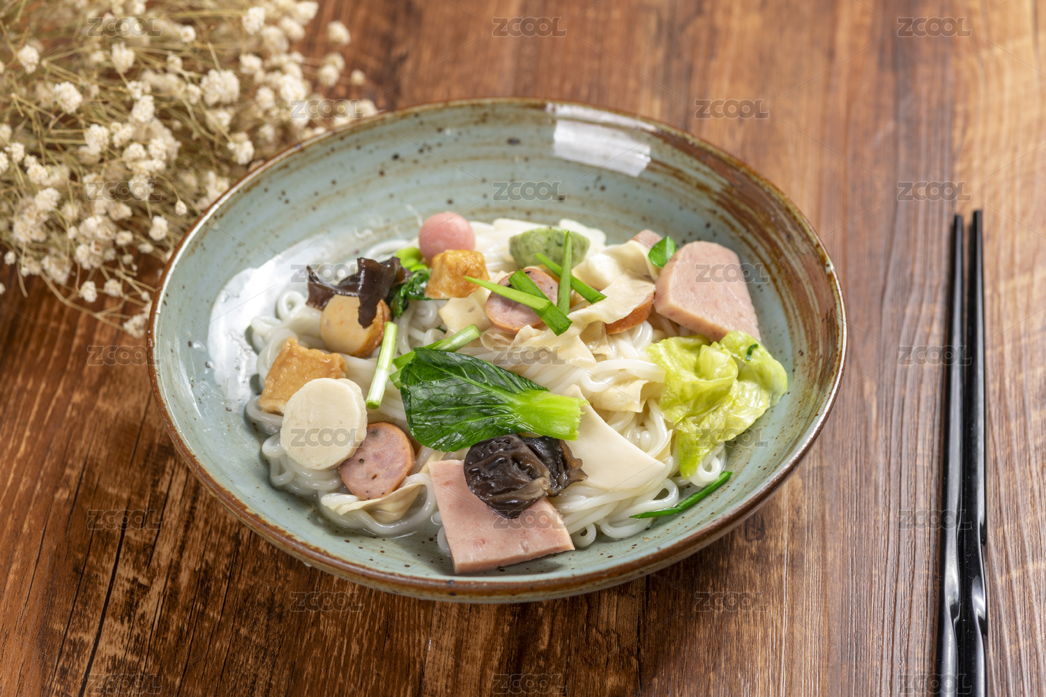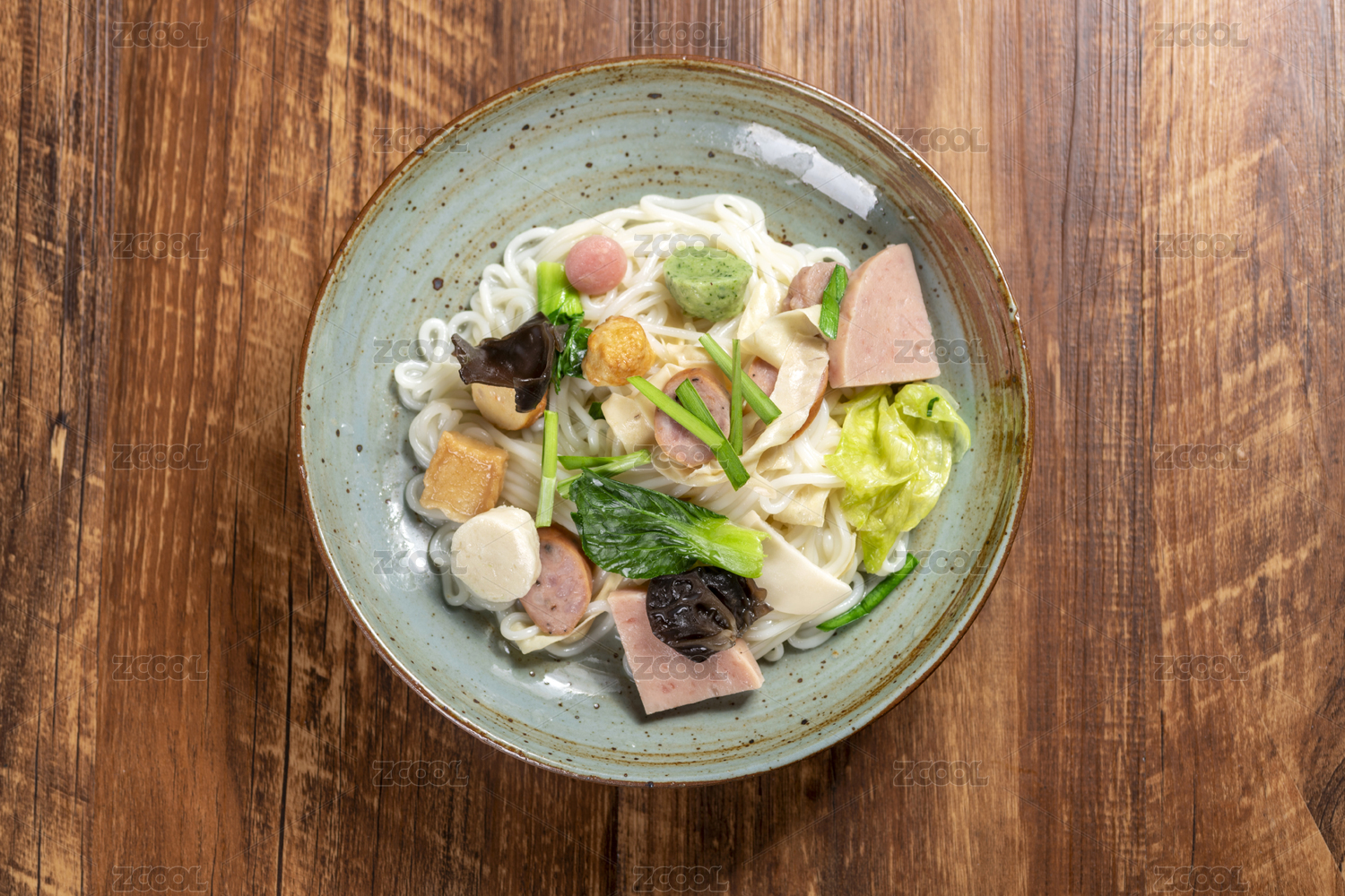 一碗什錦特色米線擺放在木桌面上特寫(xiě)