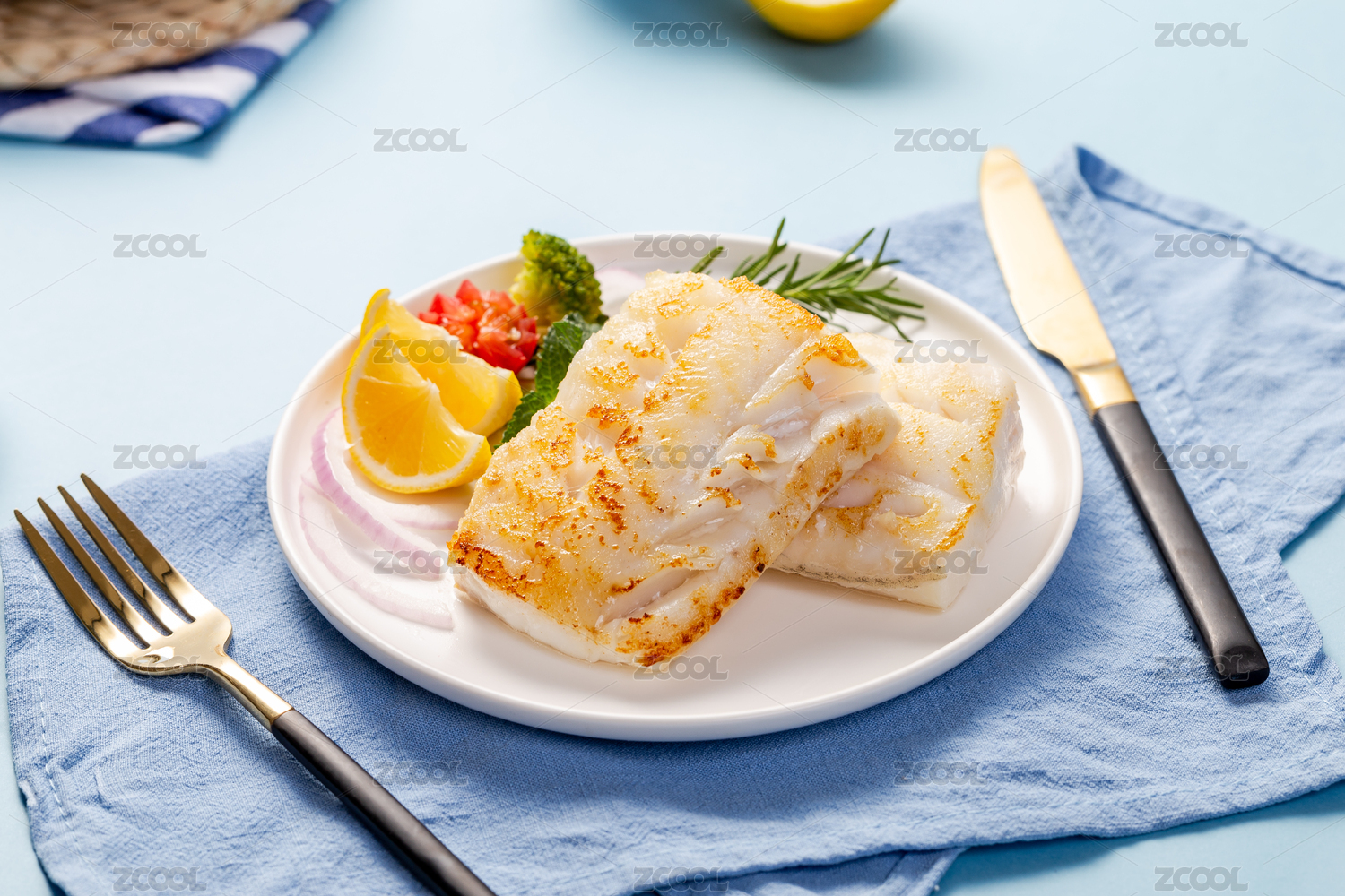 藍(lán)色背景上一盤(pán)美味的鱈魚(yú)
