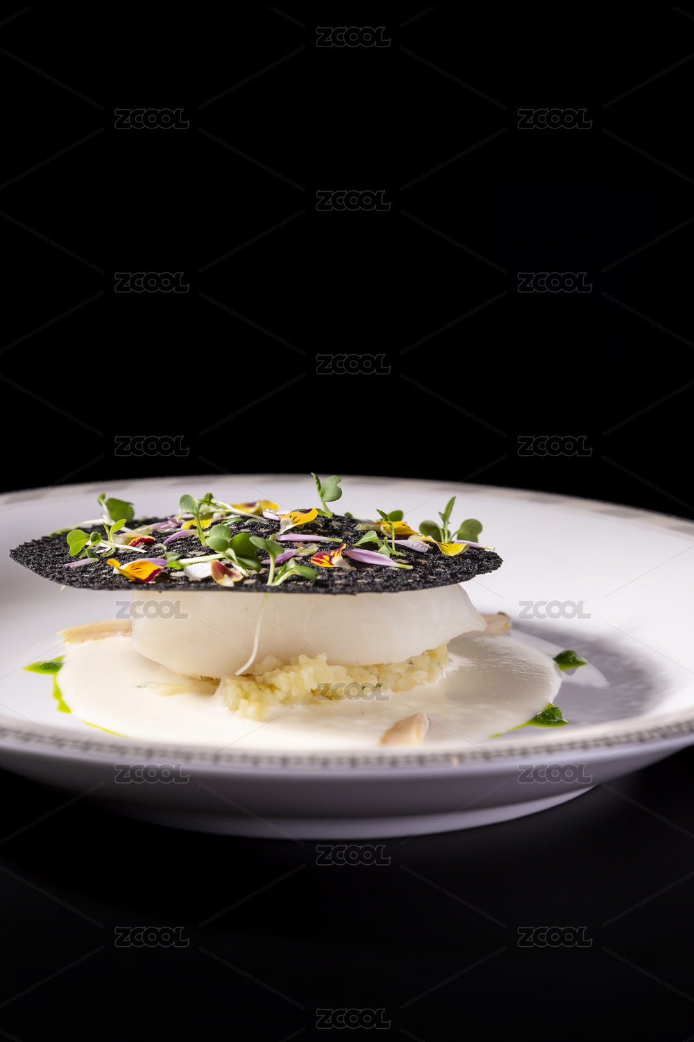 黑色背景上一盤(pán)日式料理鱈魚(yú)塊
