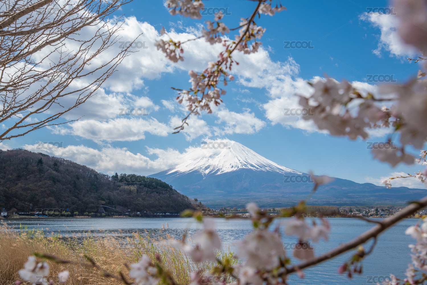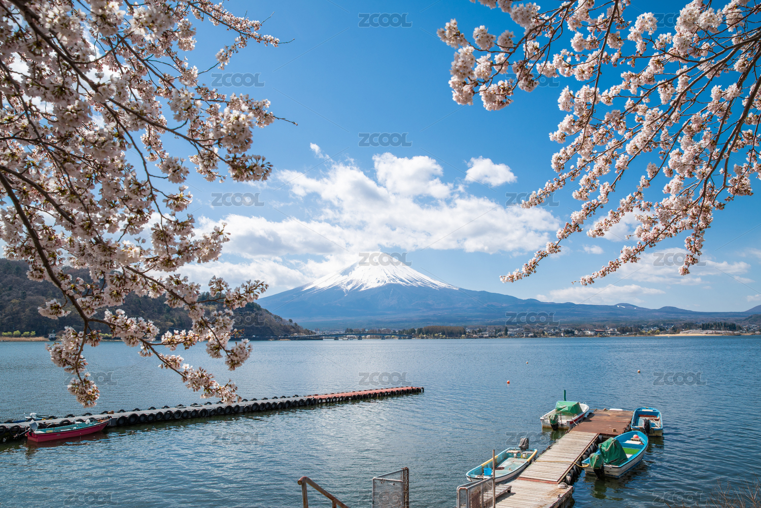日本山梨縣河口湖,藍(lán)天下湖畔的櫻花、松樹(shù)與富士山