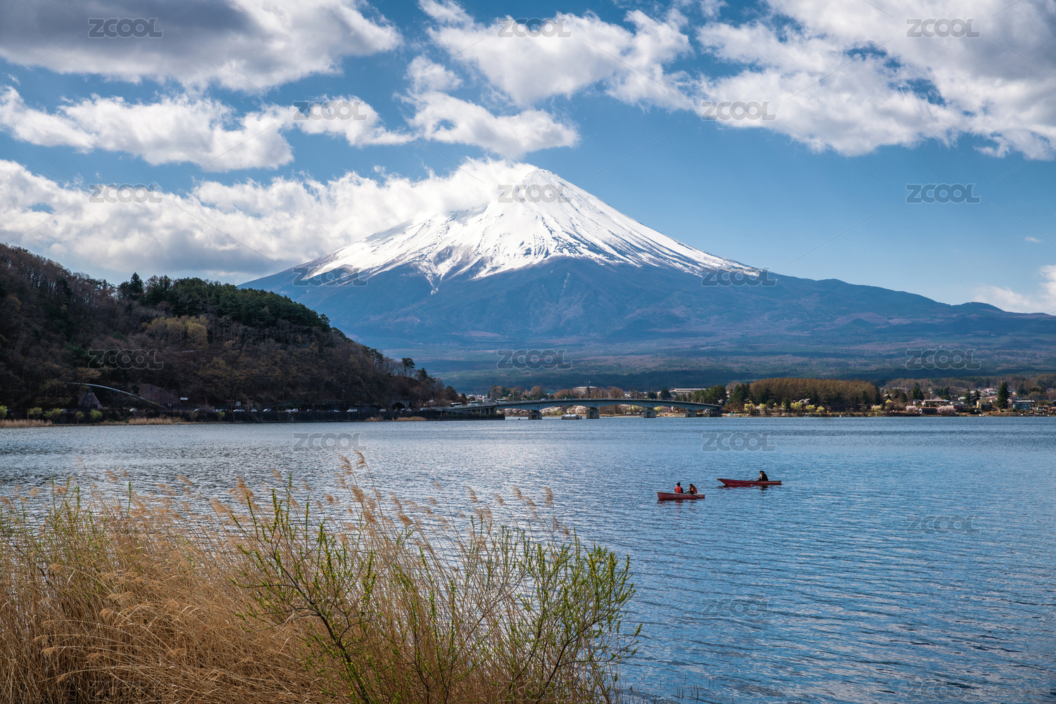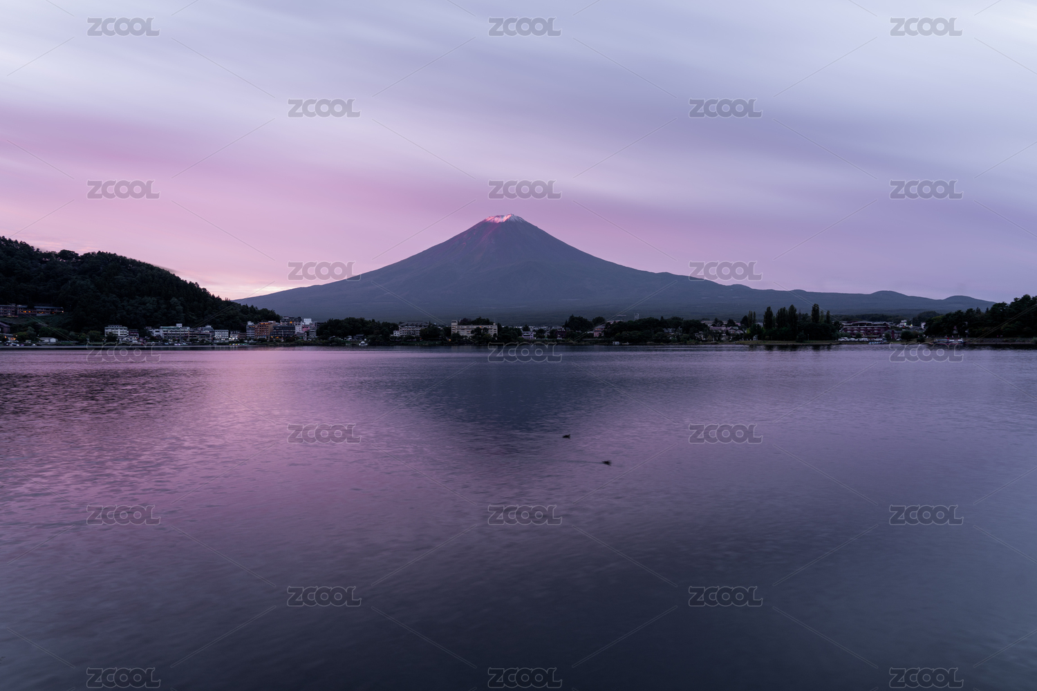 日本山梨縣河口湖,清晨日出時(shí)被晨光染色的富士山