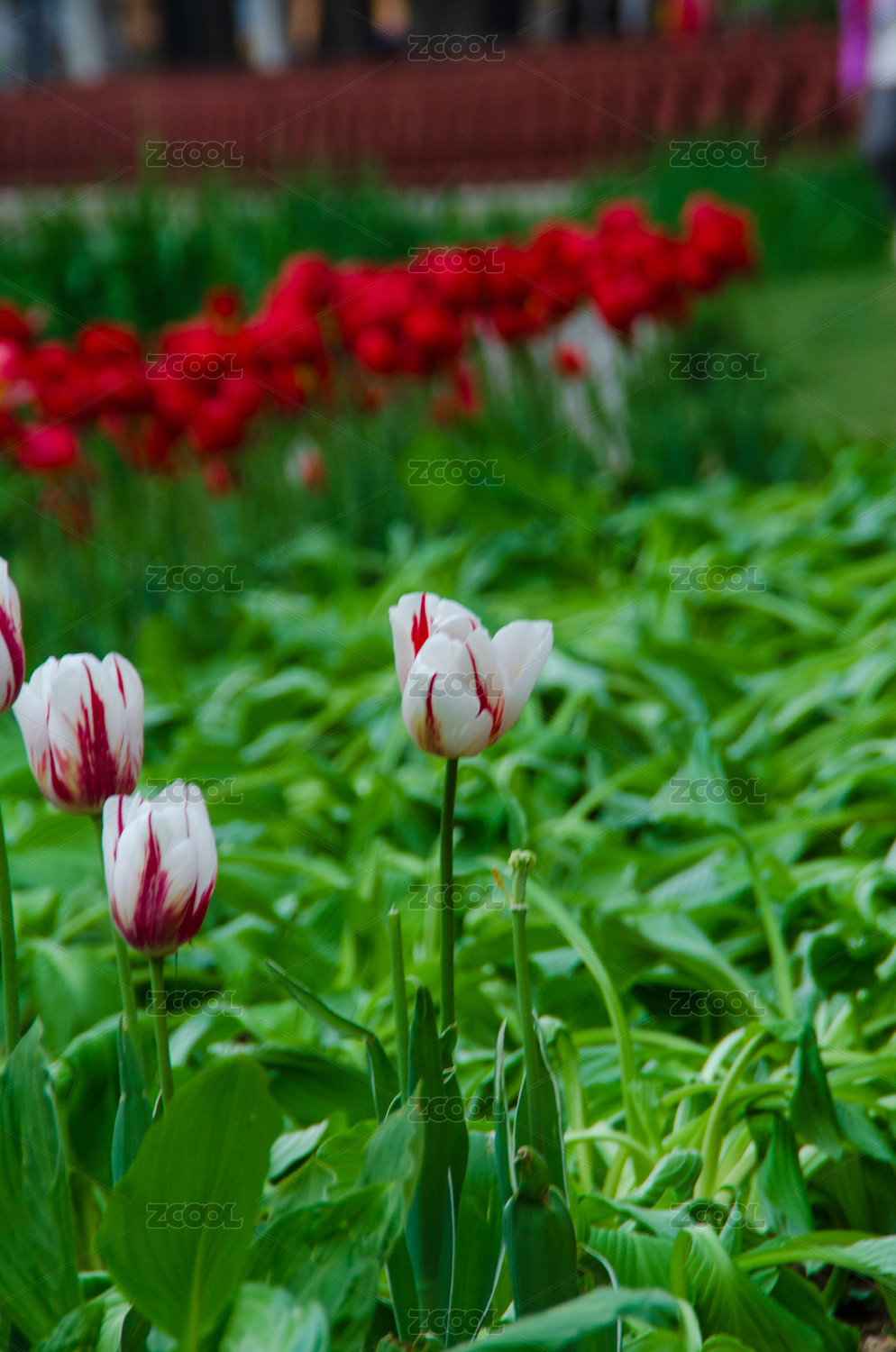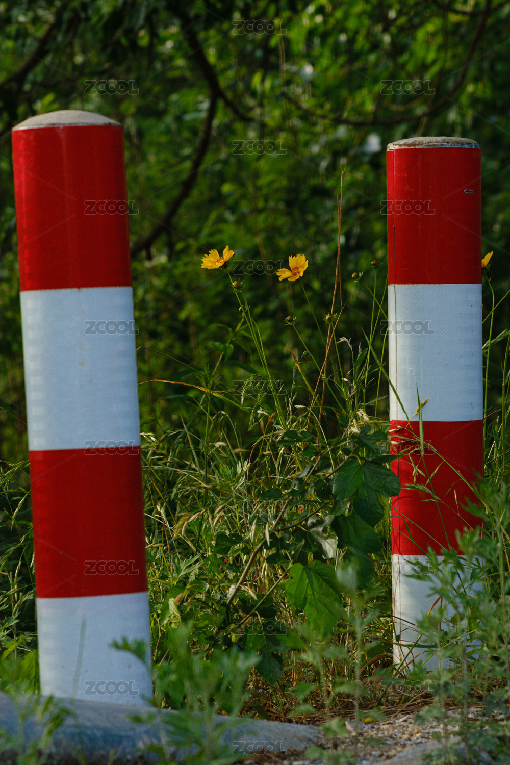 春季長在紅白欄桿邊的兩朵盛開的大花金雞菊