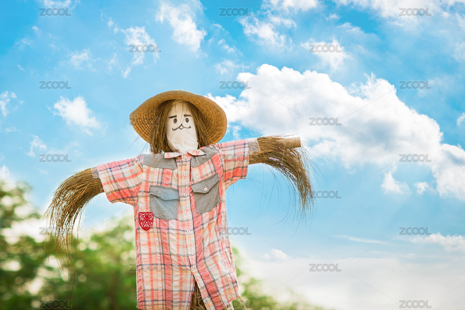 藍天白云下有個穿紅白格子衫戴草帽的稻草人