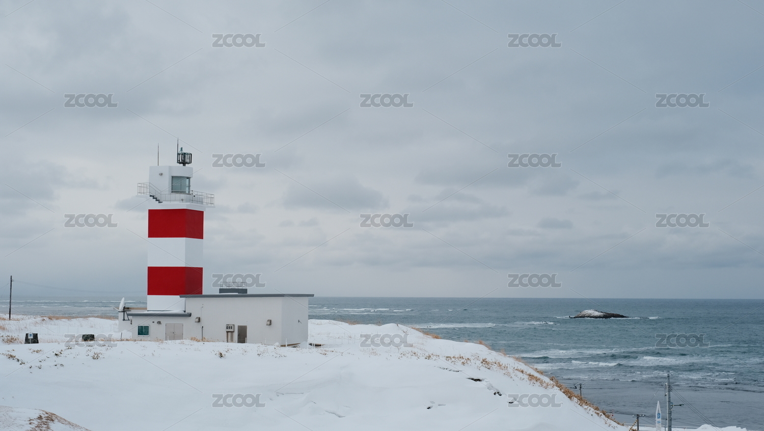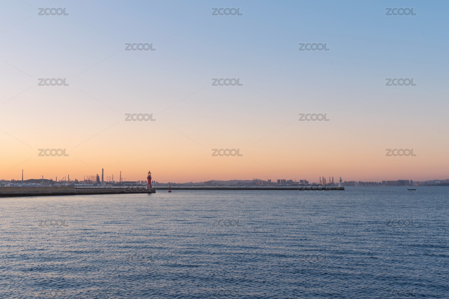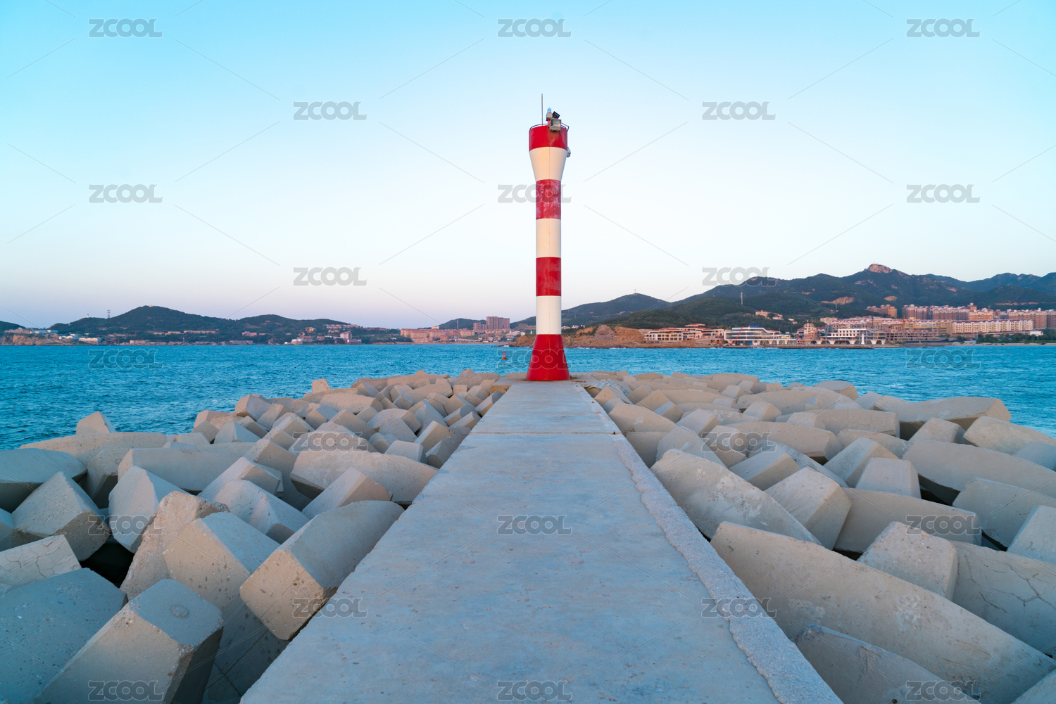 大連東港燈塔日落照片 余暉映照紅白燈塔海