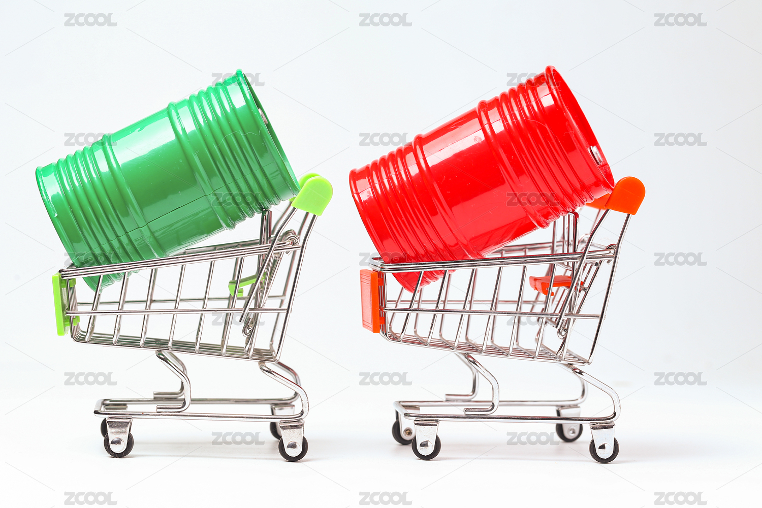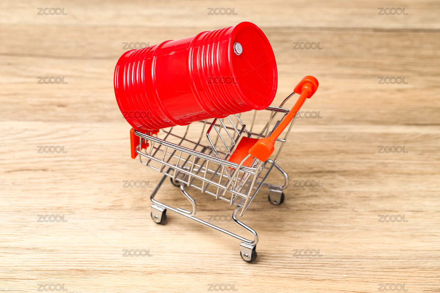 石油原油油桶放在購(gòu)物車?yán)镌诎咨尘扒?/div>