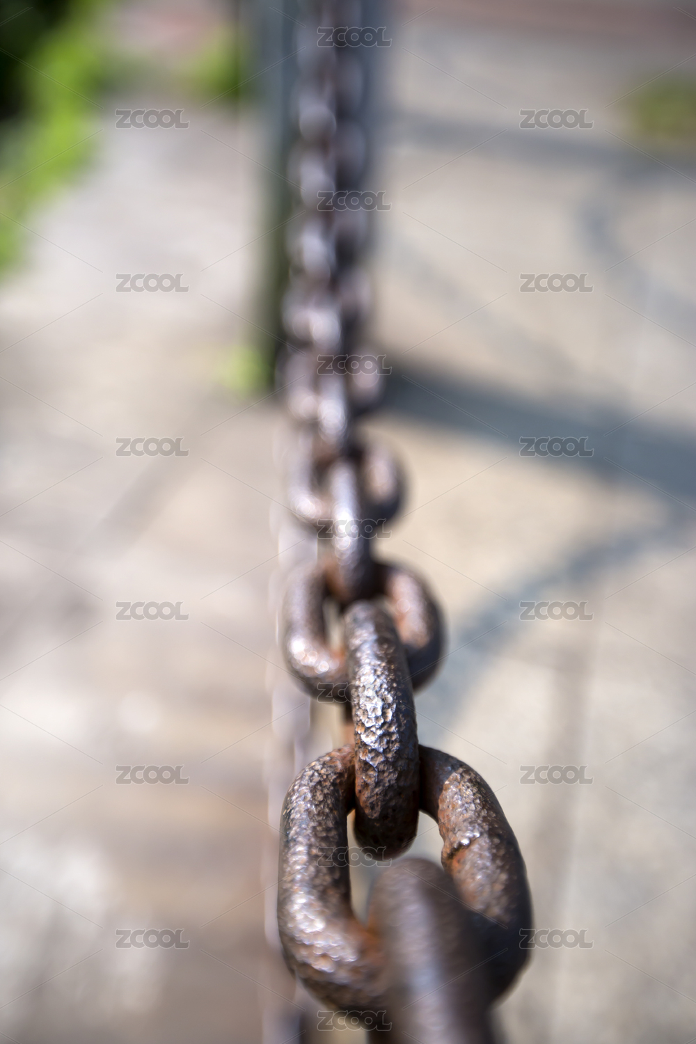 陽光下戶外公園湖岸景觀旁邊生銹的粗鐵鏈