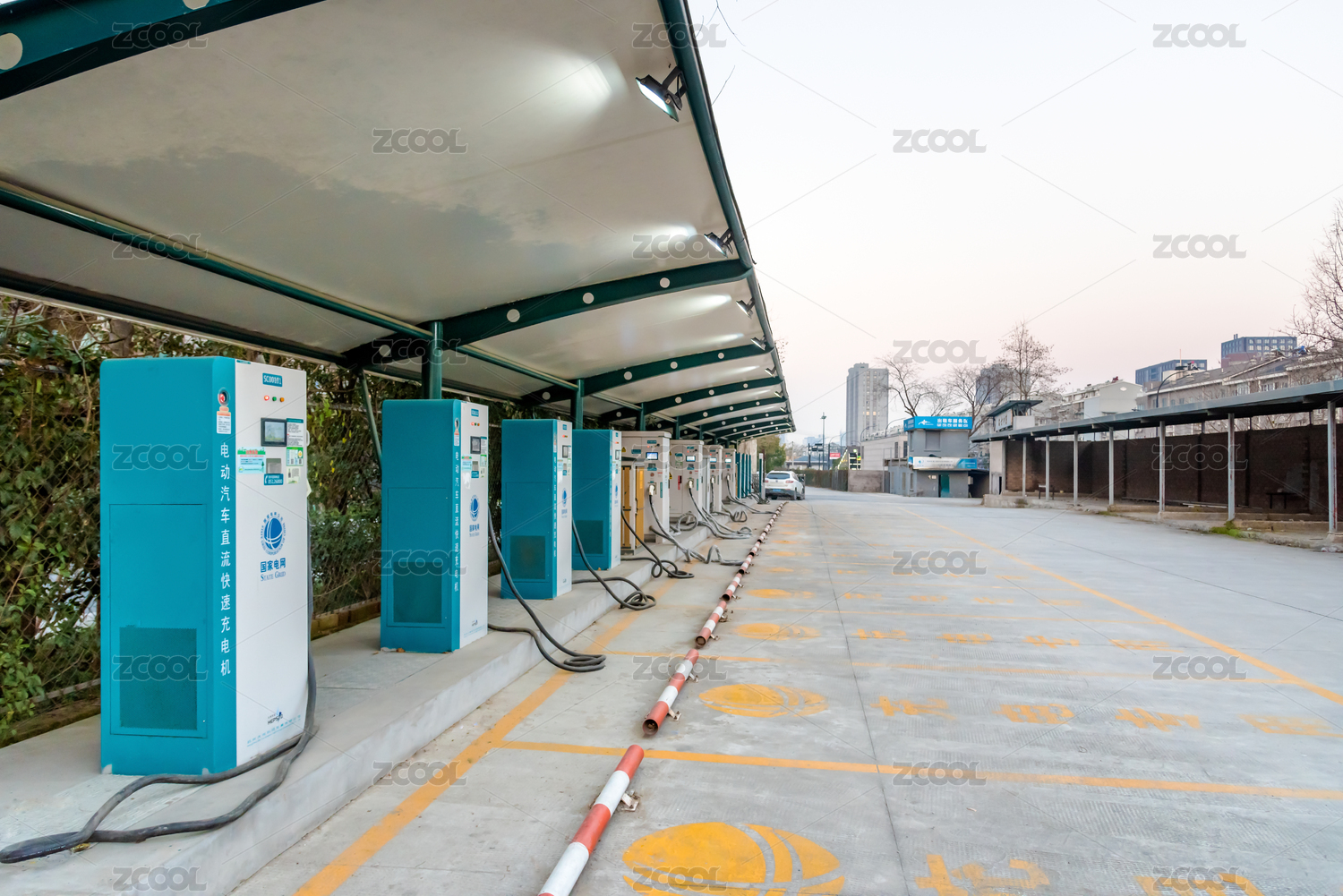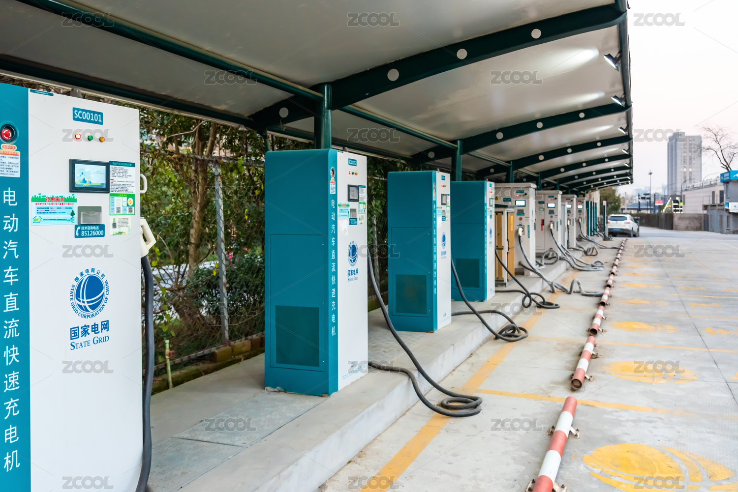 電動汽車充電站,停車場內(nèi)一排電動汽車直流快速充電機(jī)