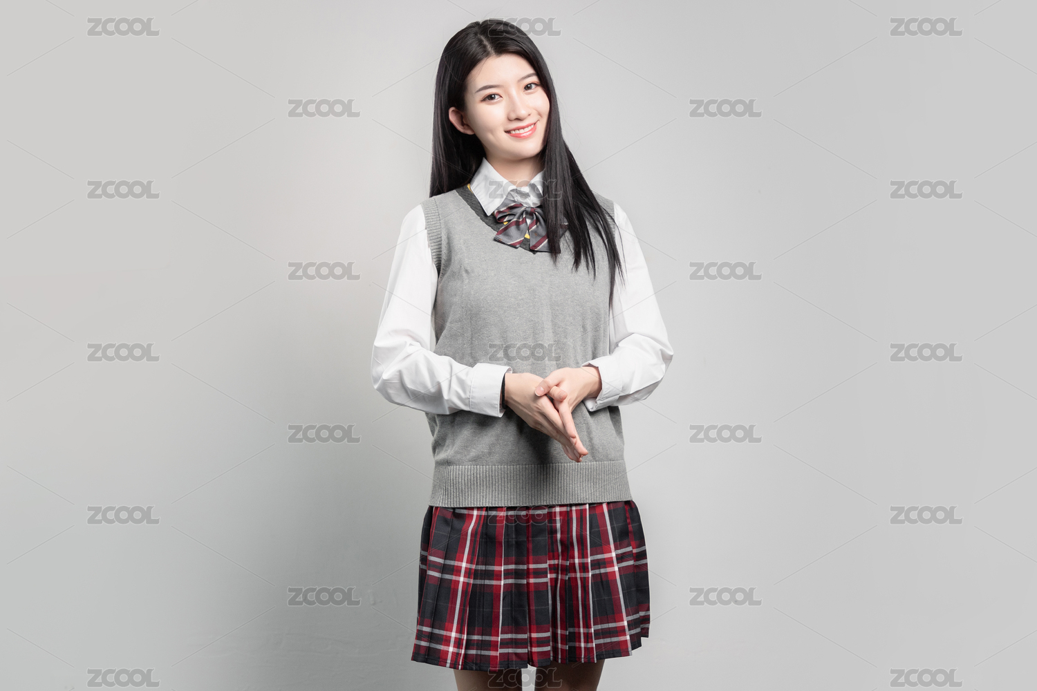 純色背景里,身穿校服的亞洲女孩