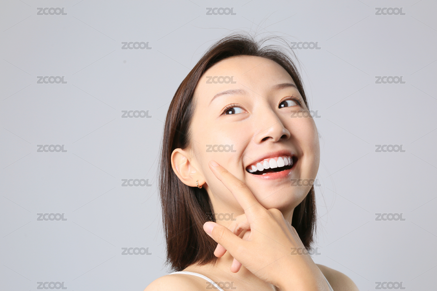 一位亞裔女孩站在純色背景墻前開心大笑用手背輕撫臉頰