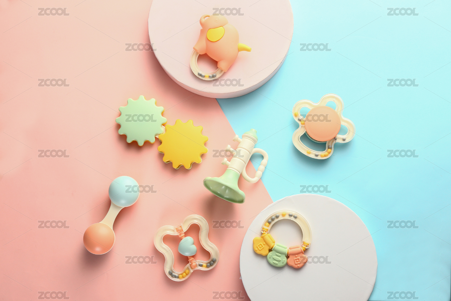 俯視純色底多個嬰兒玩具