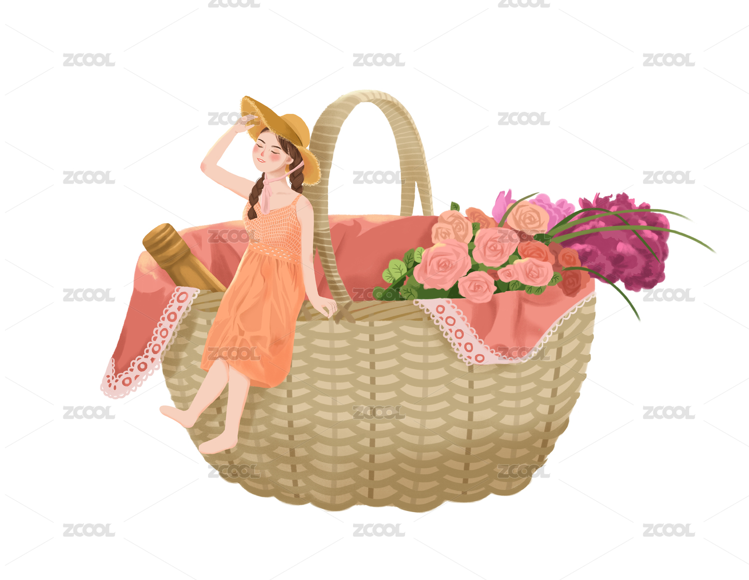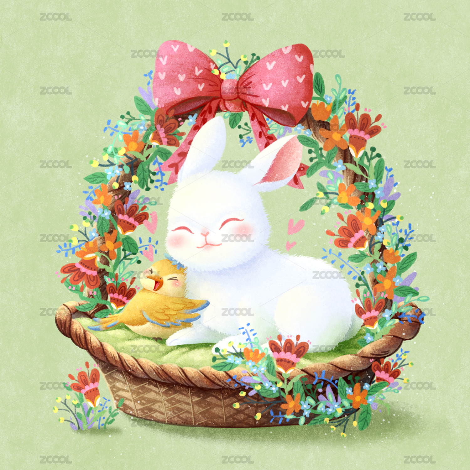十二生肖之花籃里的小白兔可愛治愈插畫