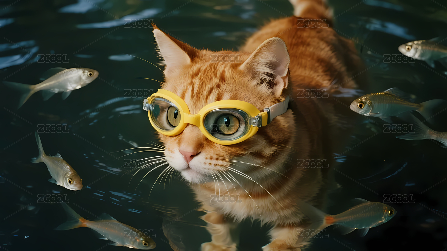 彩色玩具魚在玻璃魚缸旁配潛水鏡腳蹼