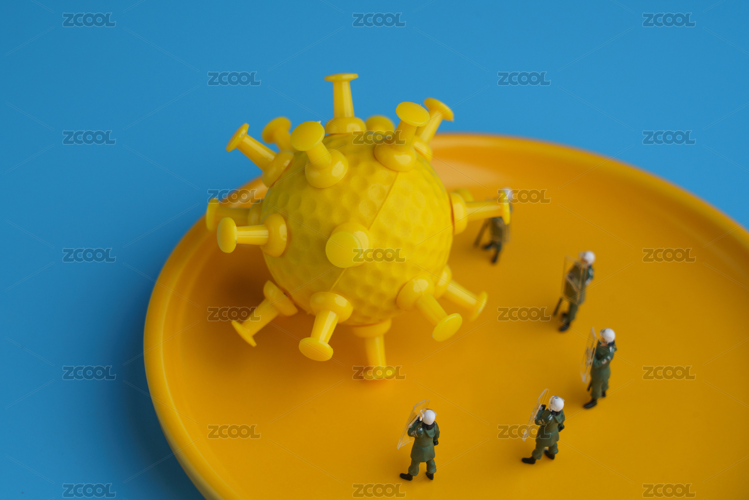 黃色盤子中在抵御病毒的防護(hù)人員微縮創(chuàng)意