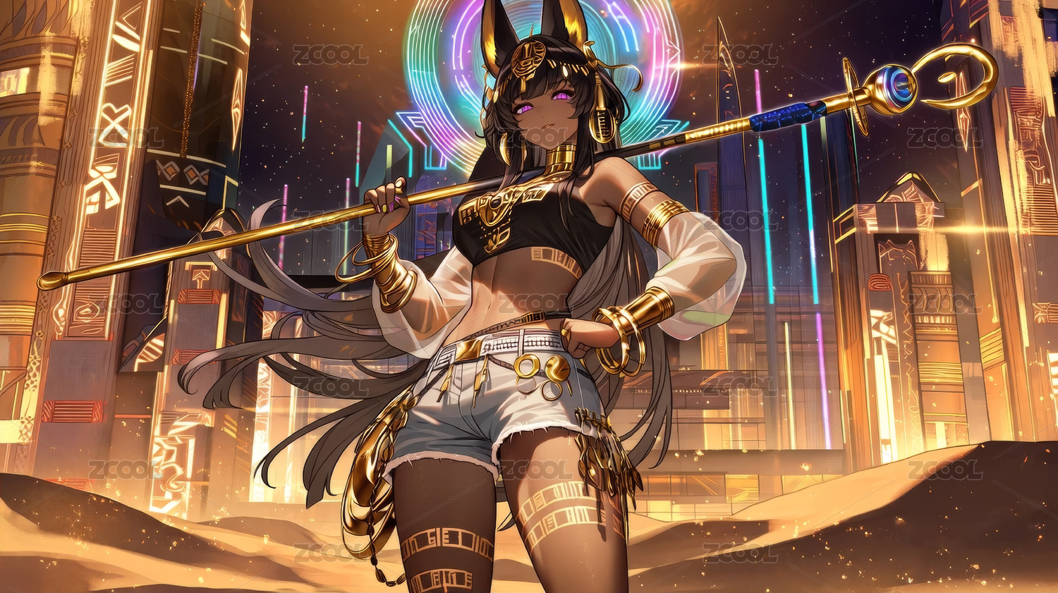 賽博朋克阿努比斯少女手持權(quán)杖站在沙漠城市
