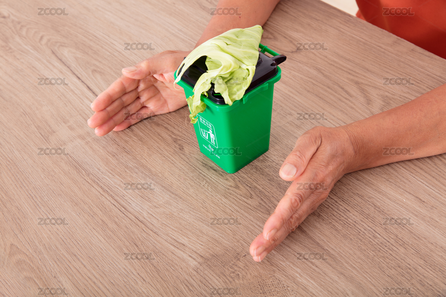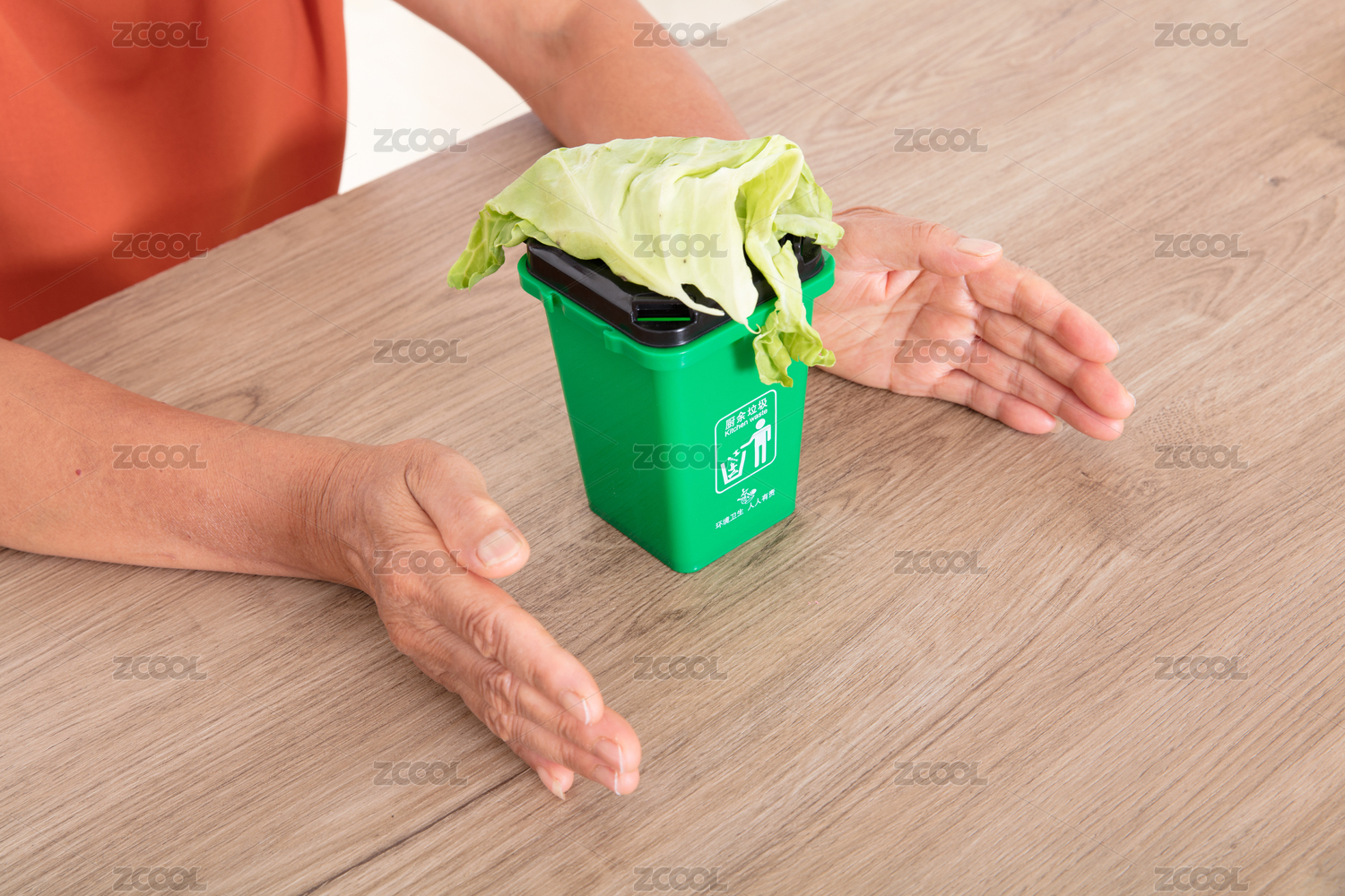 俯視拍攝中國(guó)婦女雙手呵護(hù)著桌子上的綠色廚余垃圾桶和菜葉