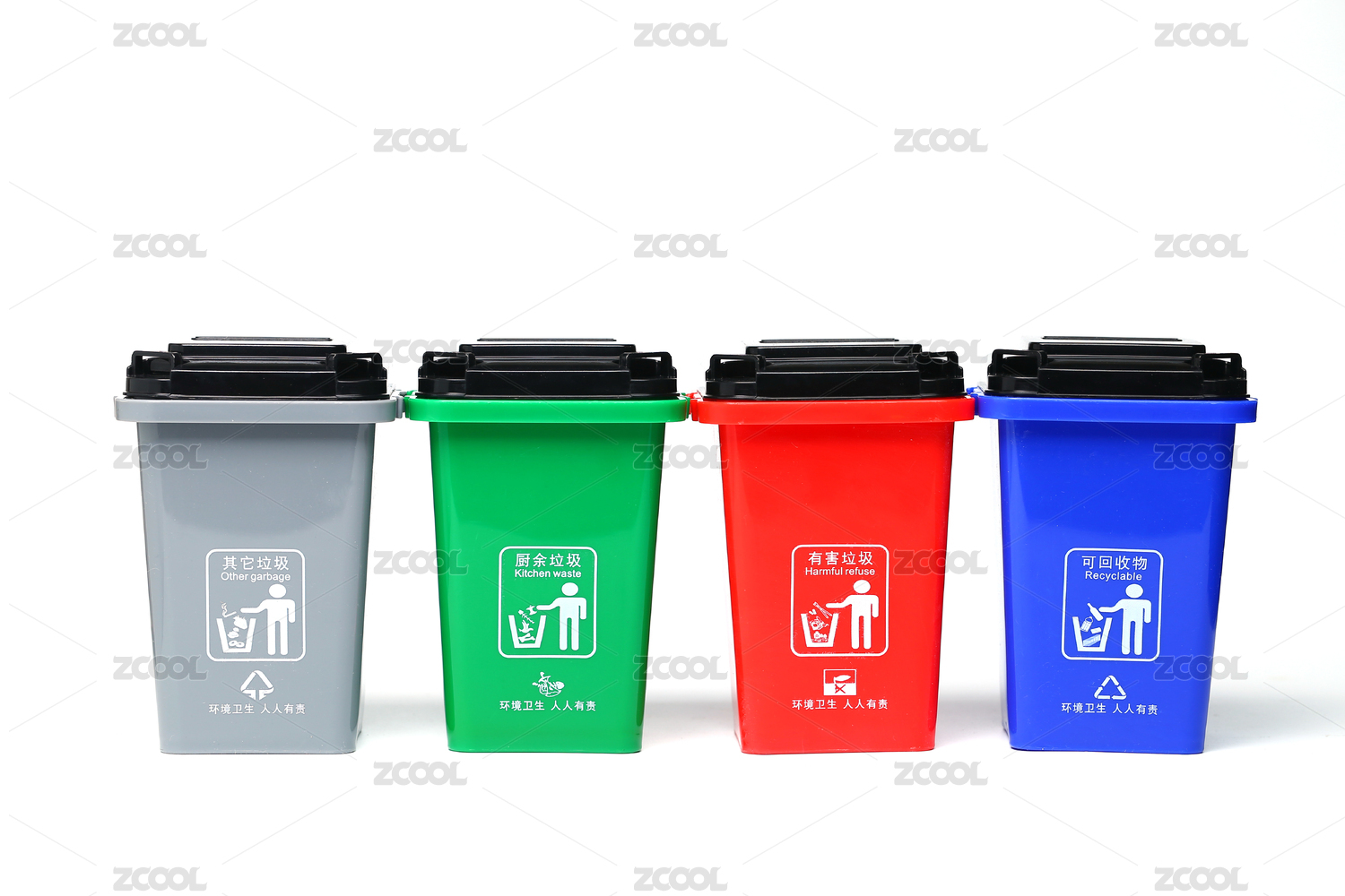 彩色的垃圾桶放在白色背景前,垃圾分類概念