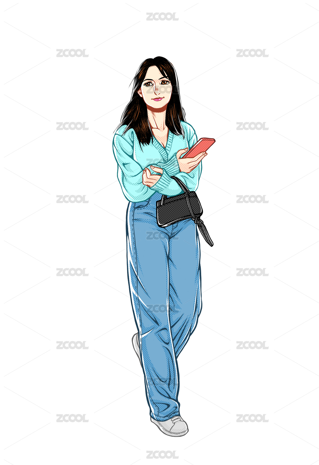穿著藍(lán)色毛衣藍(lán)色牛仔褲行走的女人挎著黑包