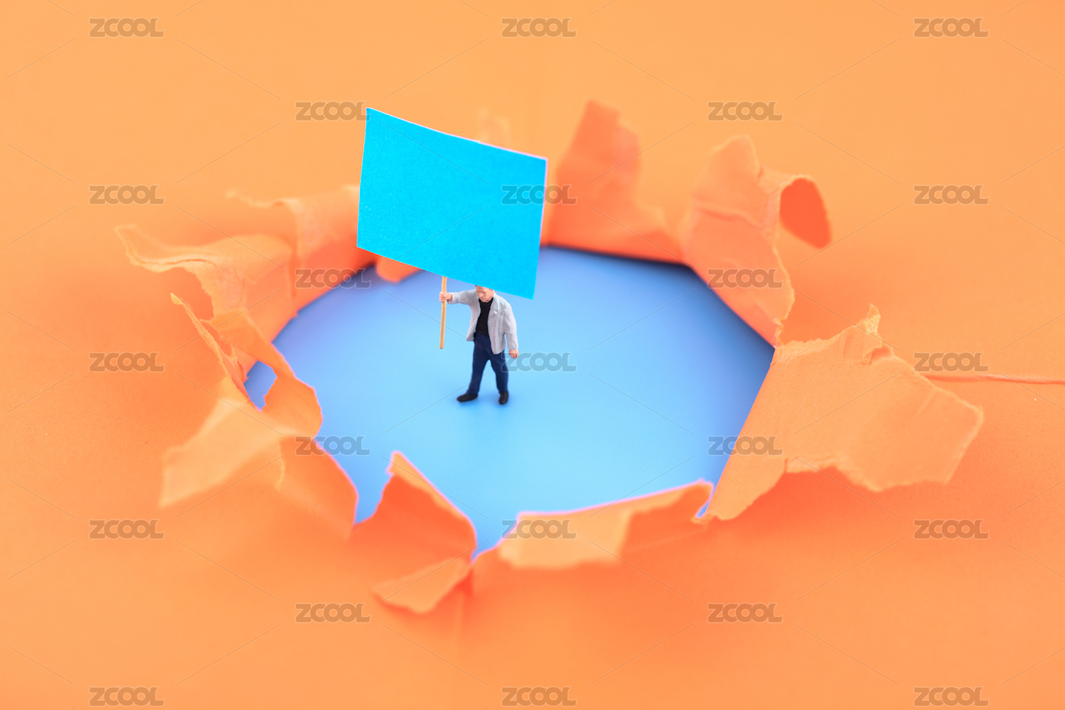 微縮創(chuàng)意破開的紙洞舉牌的人