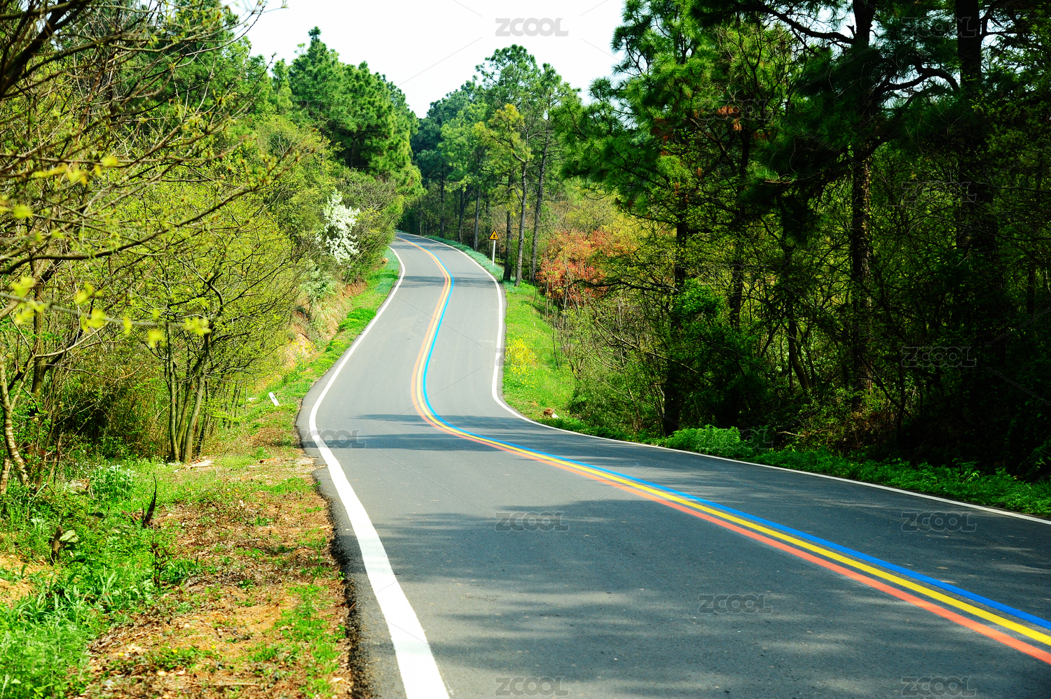 帶有紅黃藍三色隔離線的彎曲彩色公路