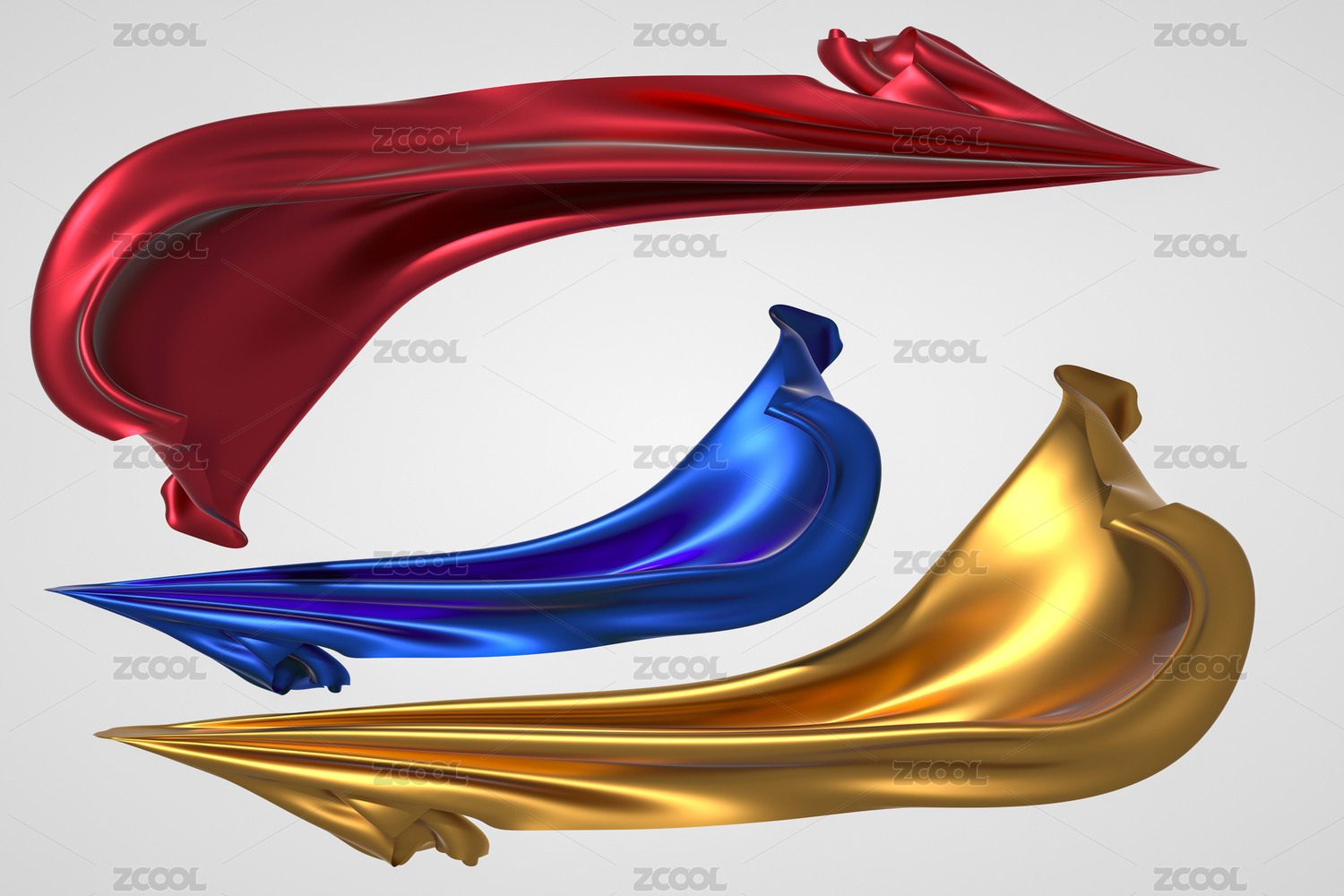 3D建模渲染的紅黃藍絲綢布料飄帶