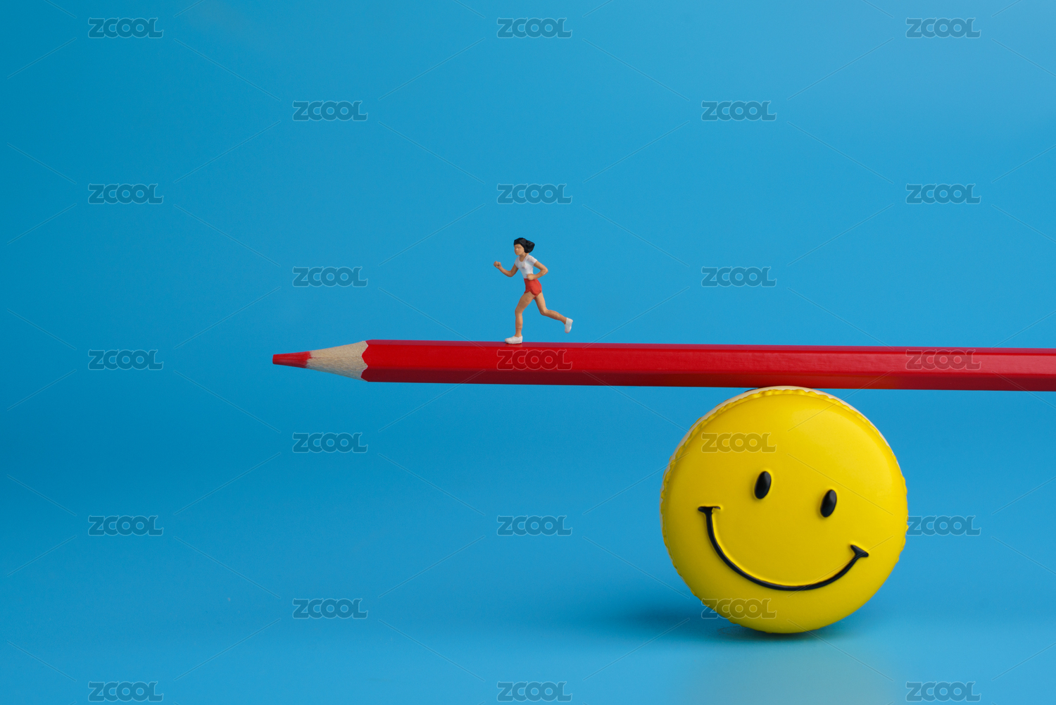 在紅黃藍三原色背景中奔跑的女士和笑臉微縮
