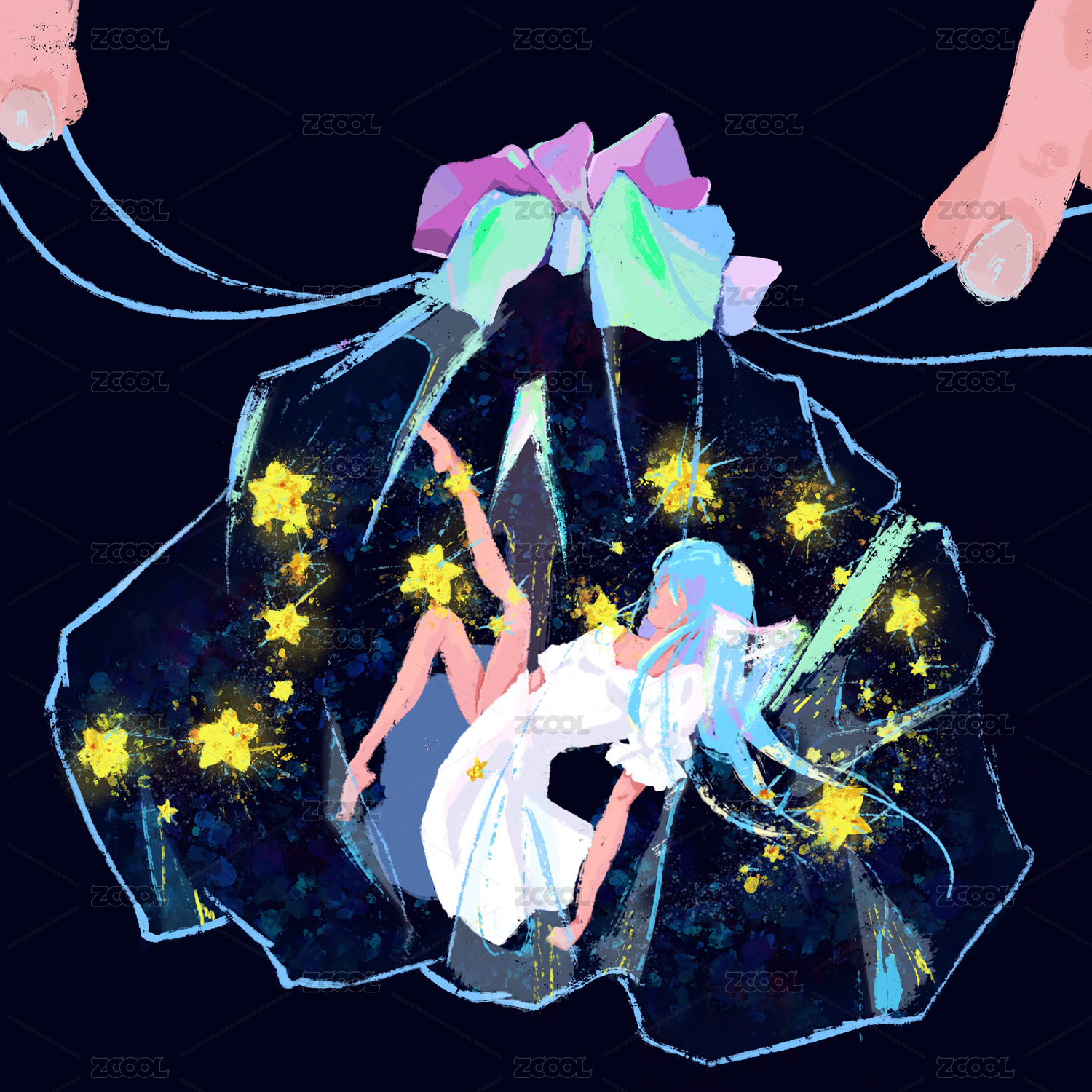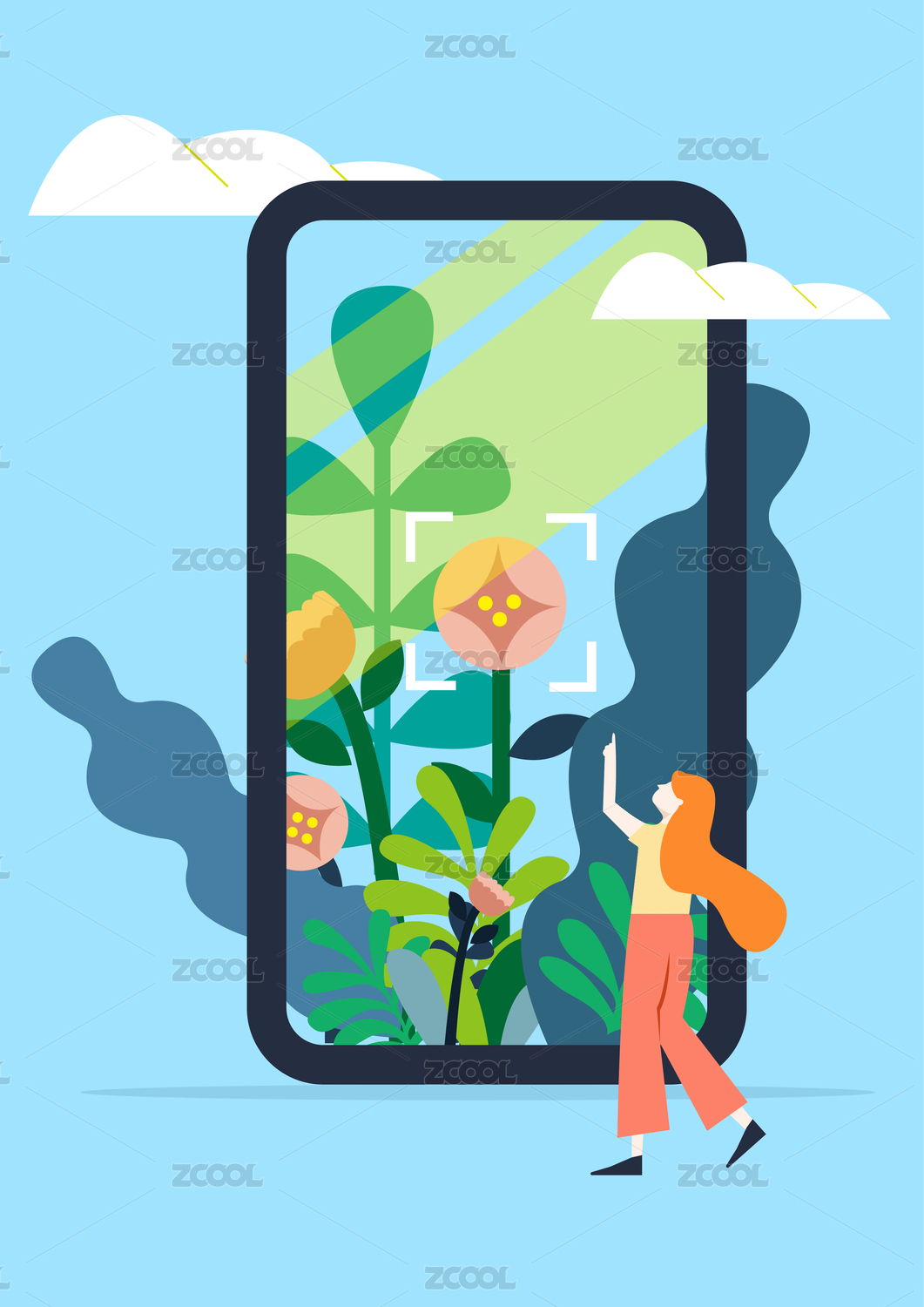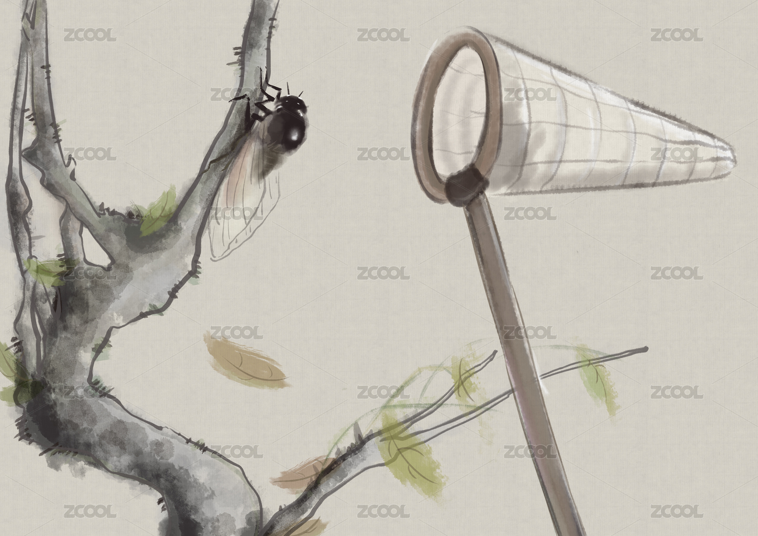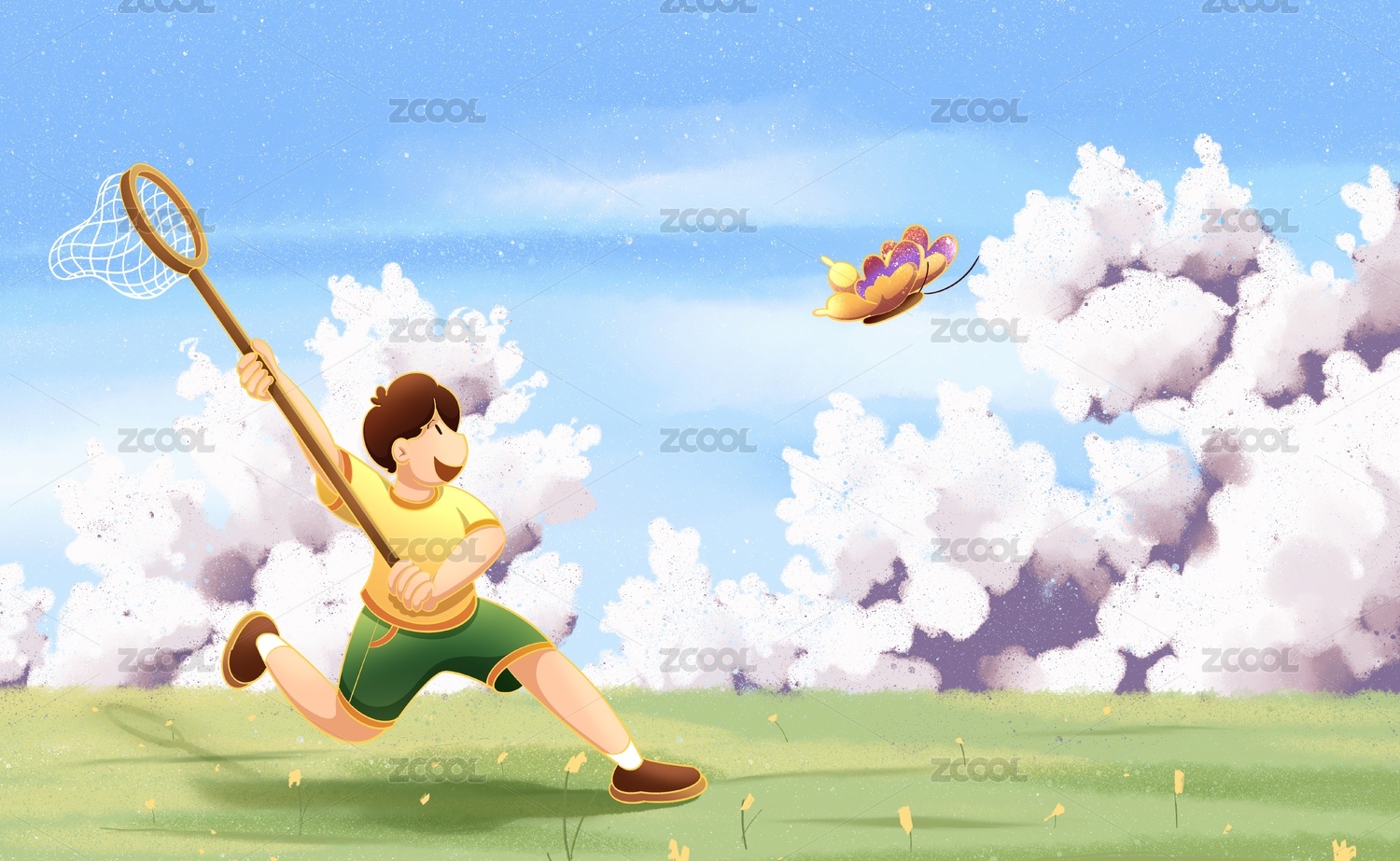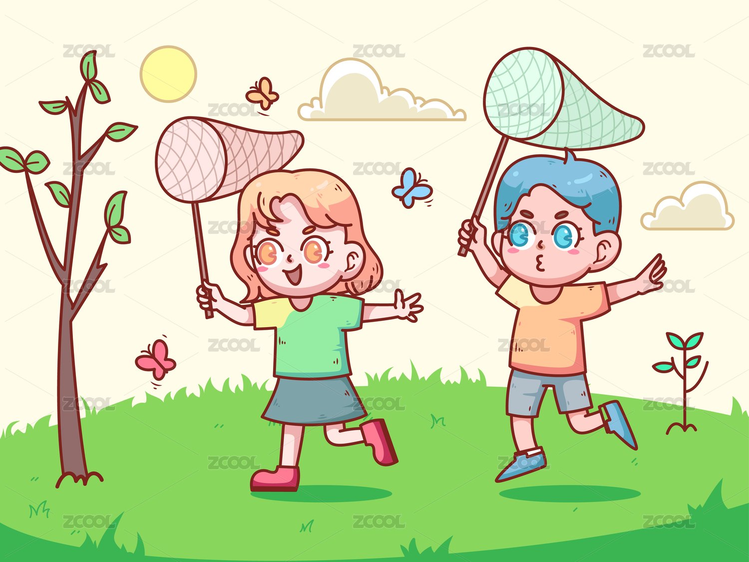 夏季田野可愛女孩捕捉昆蟲開心快樂插畫
