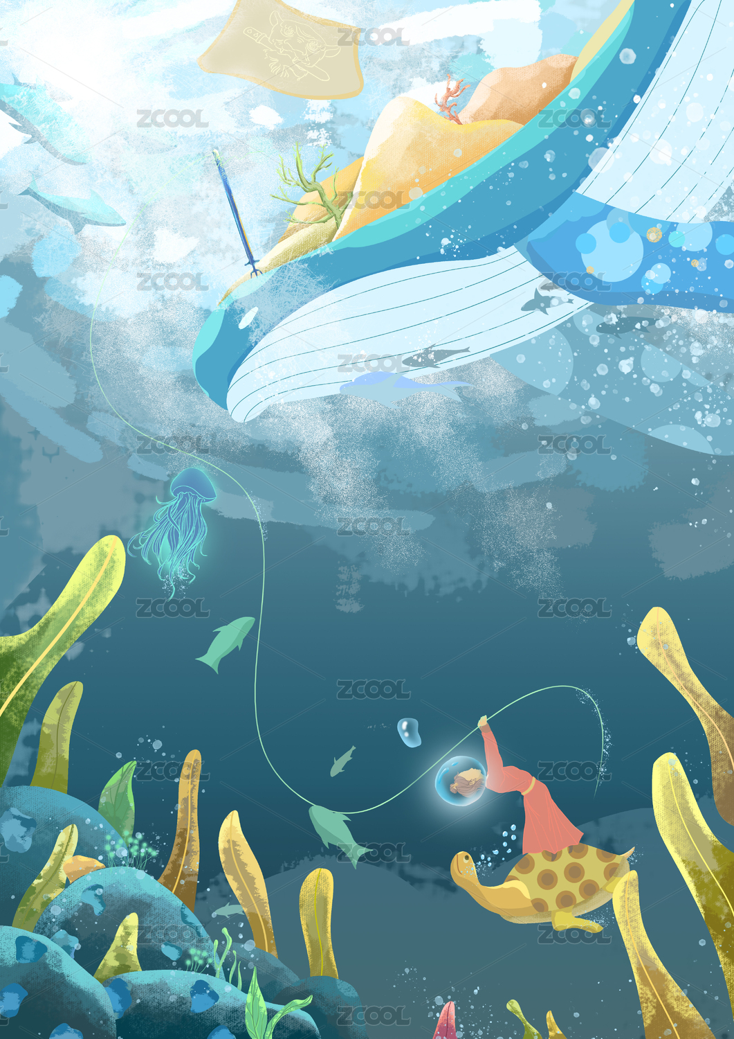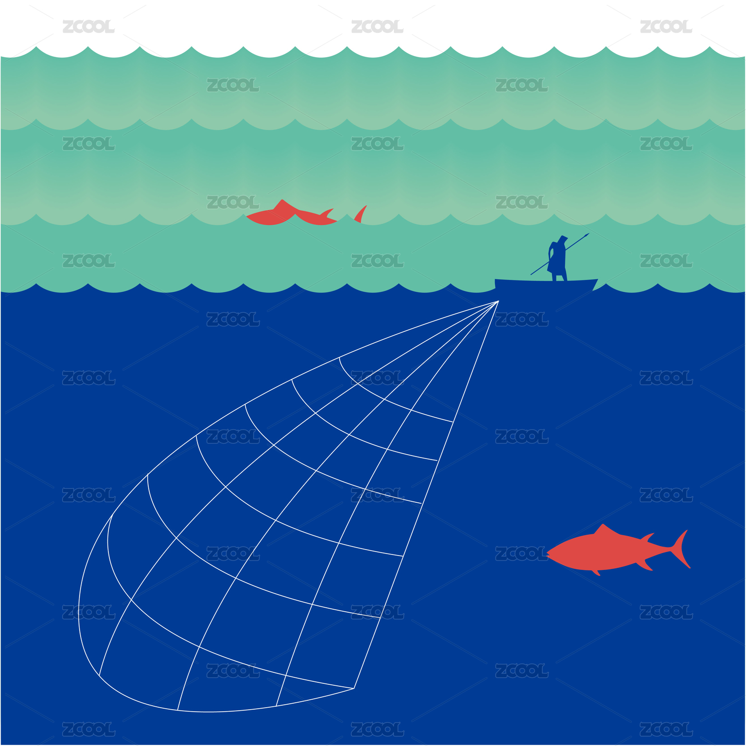 老人駛著小船在海面上捕捉他的獵物,在風浪中與自然作斗爭。矢量插畫