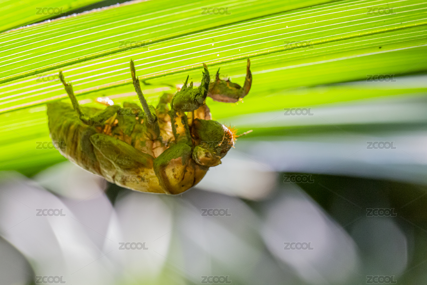 棕櫚葉上的蟬蛻特寫