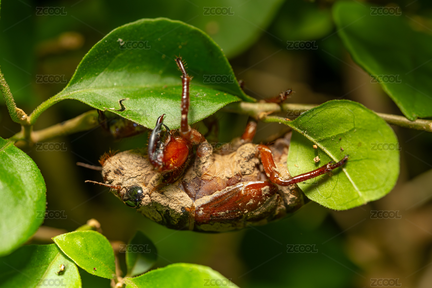 綠葉上的蟬蛻特寫