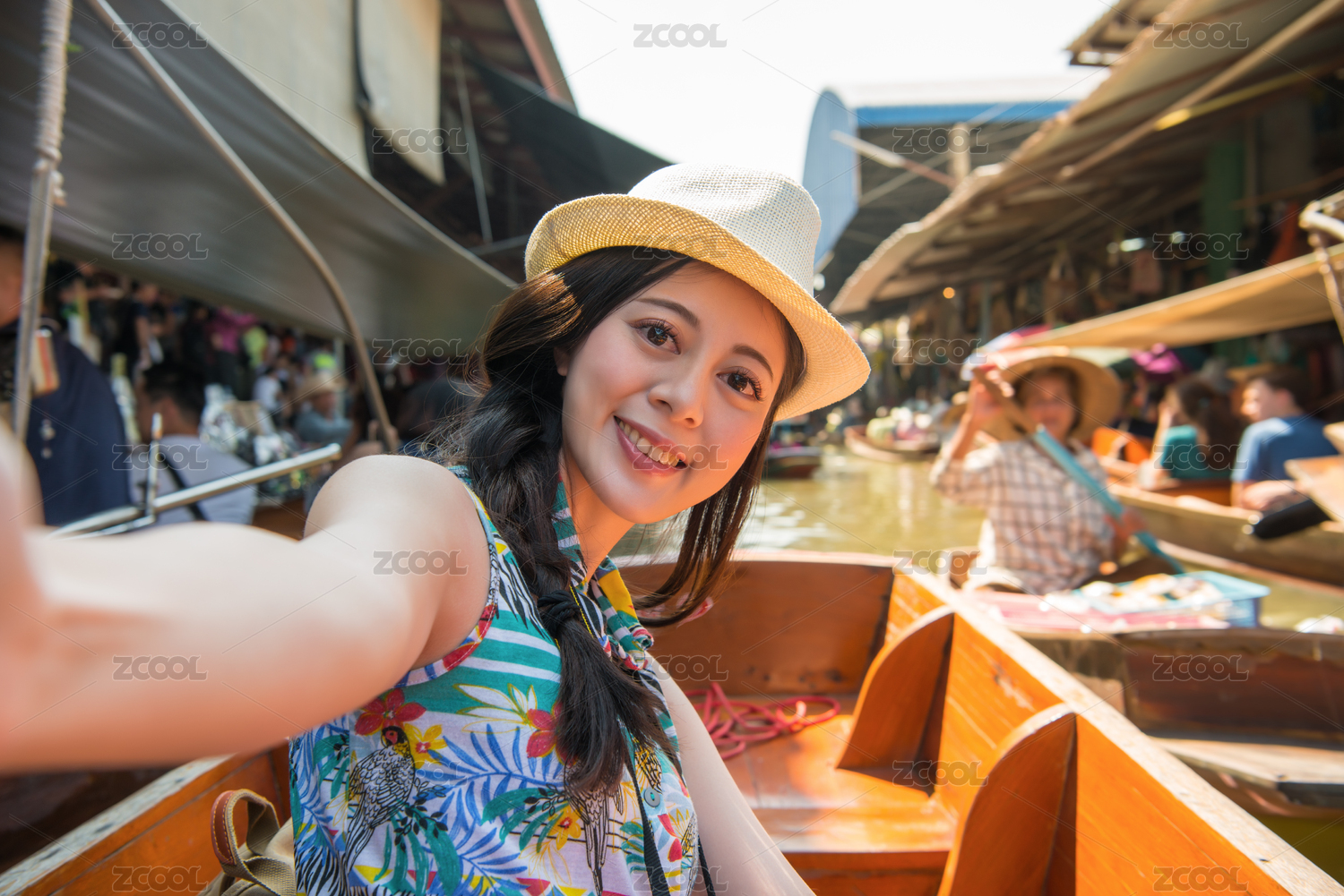 快樂漂亮的姑娘旅游服用自拍照片自拍的小船時(shí),她亞洲泰國(guó)旅游期間訪問(wèn)流行的懸浮式市場(chǎng)。