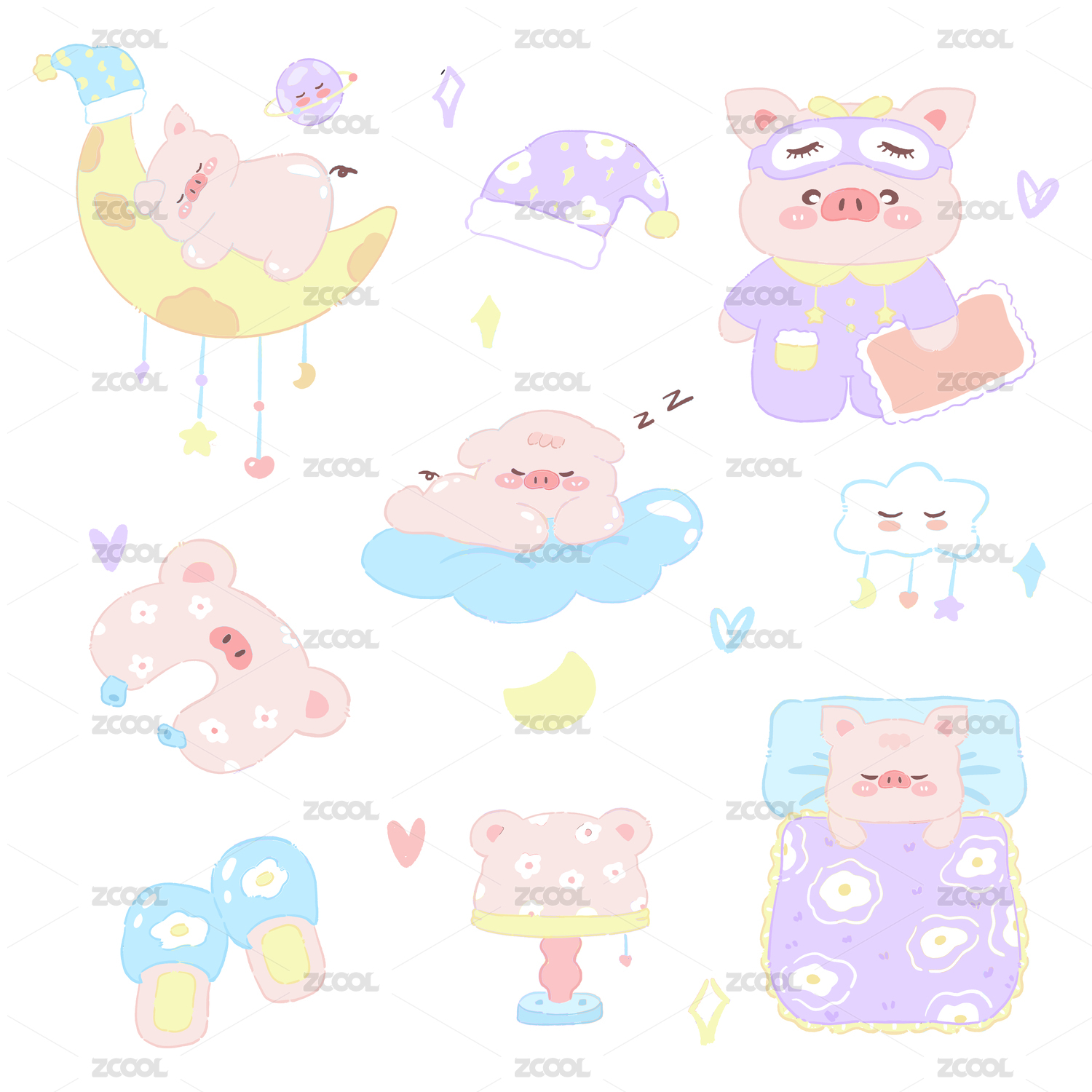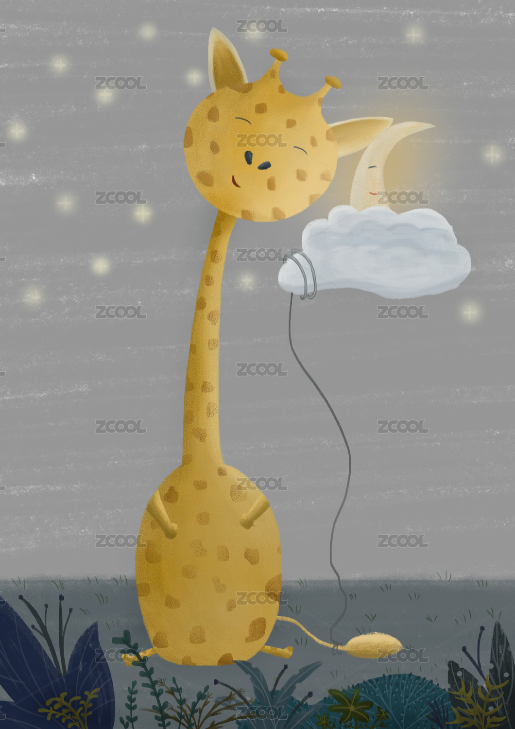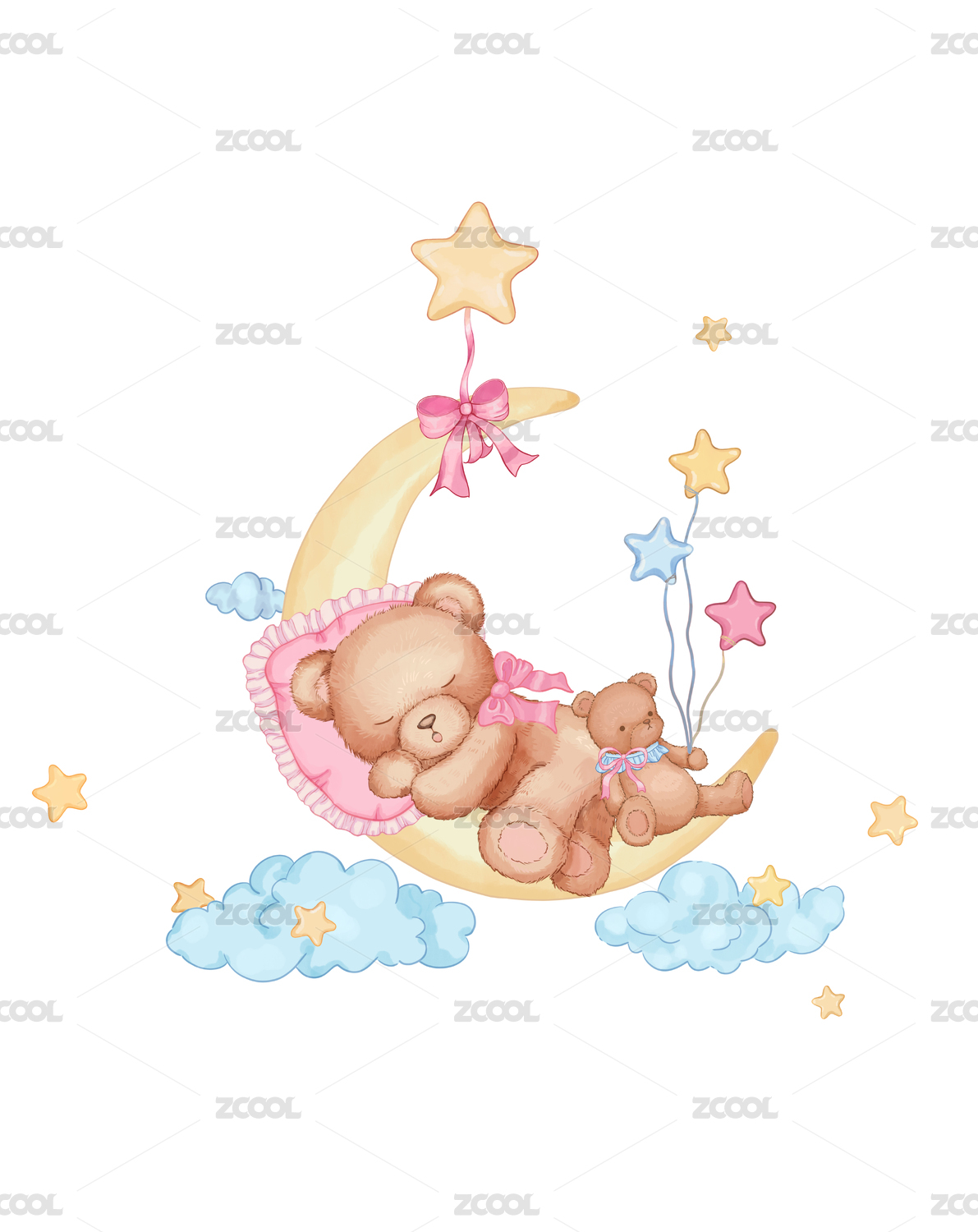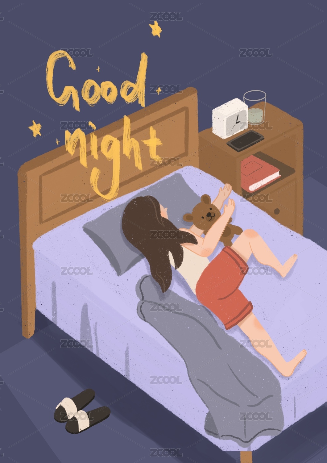 兔子和卷發(fā)女孩一起睡覺晚安插畫