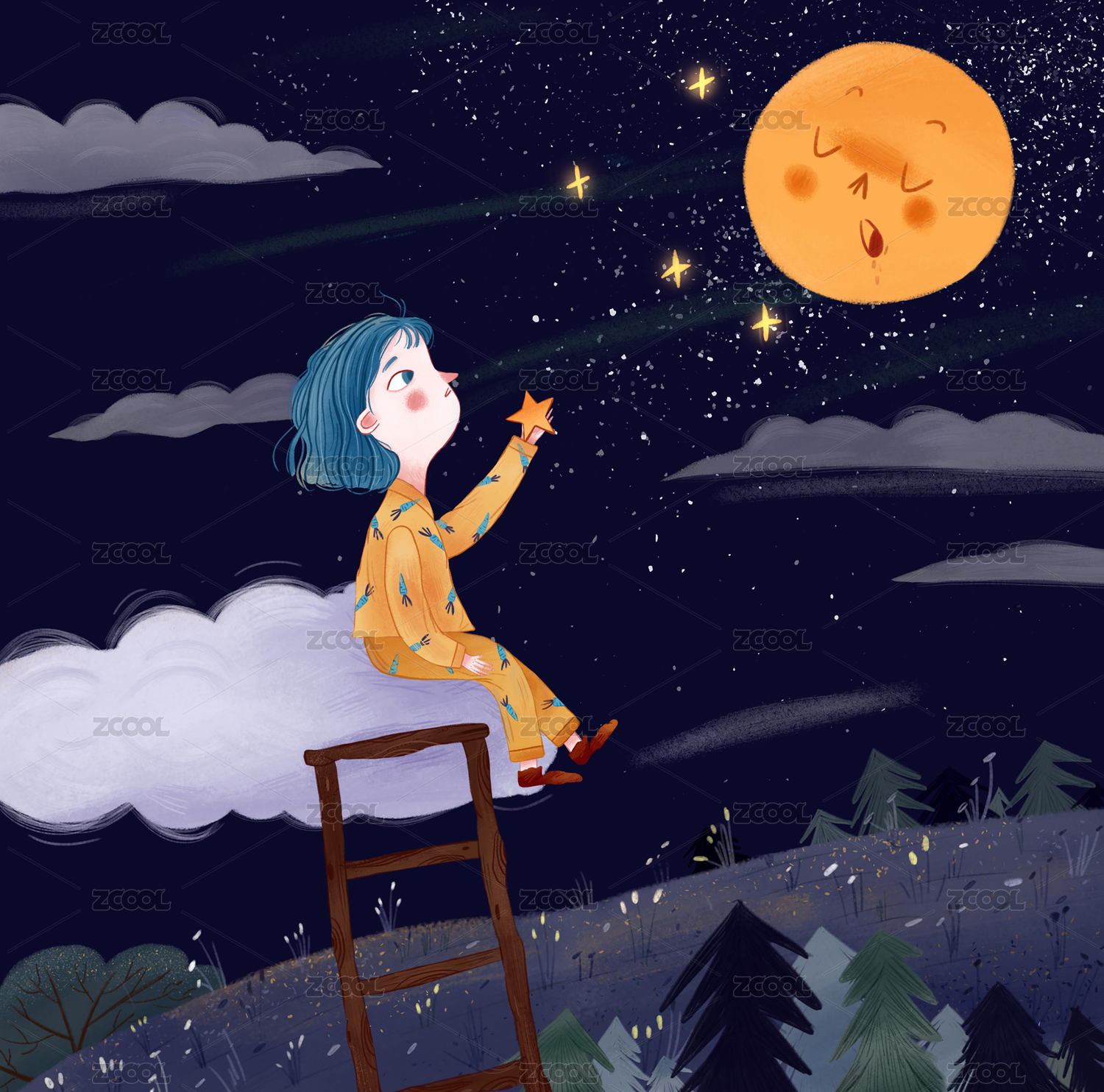 卷發(fā)女孩在夢中飛到夜空睡覺晚安插畫