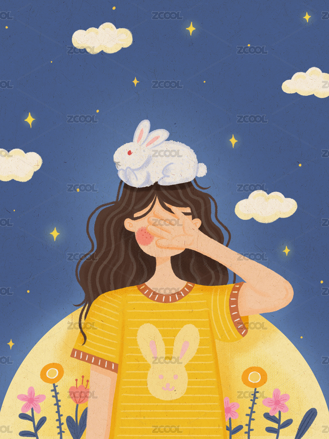 兔子在卷發(fā)女孩頭上睡覺晚安插畫