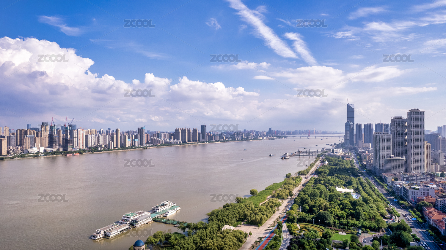 從武昌江邊遠(yuǎn)眺藍(lán)天白云下的漢口城市風(fēng)光