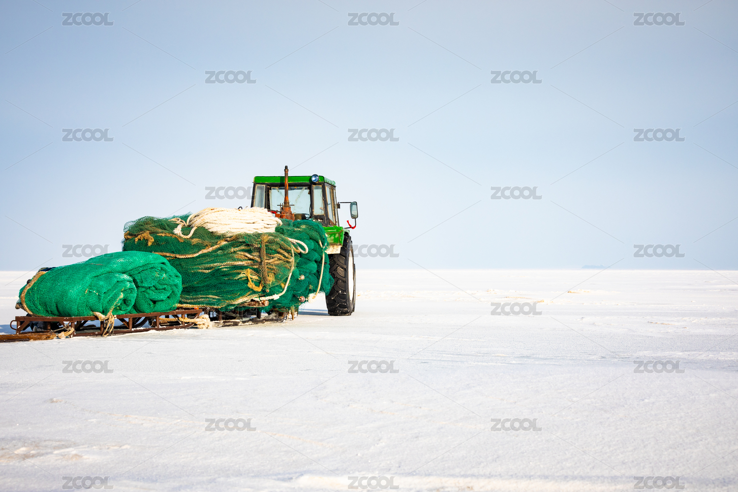內(nèi)蒙古達里湖雪地上的拖拉機拉著漁網(wǎng)