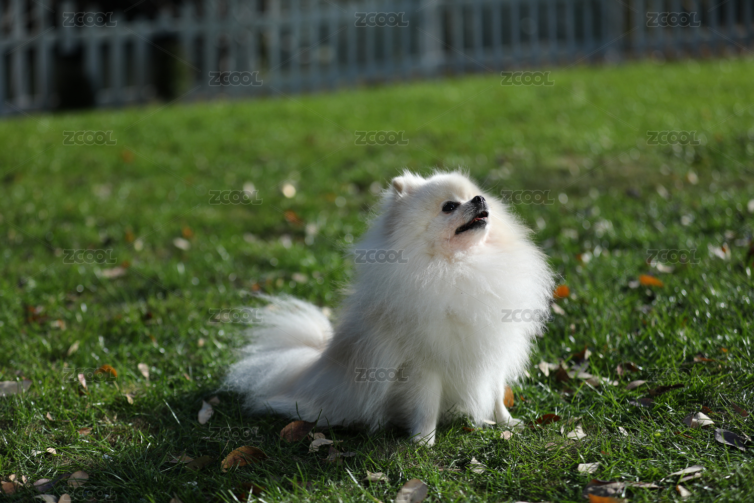坐在草地上的白色博美犬