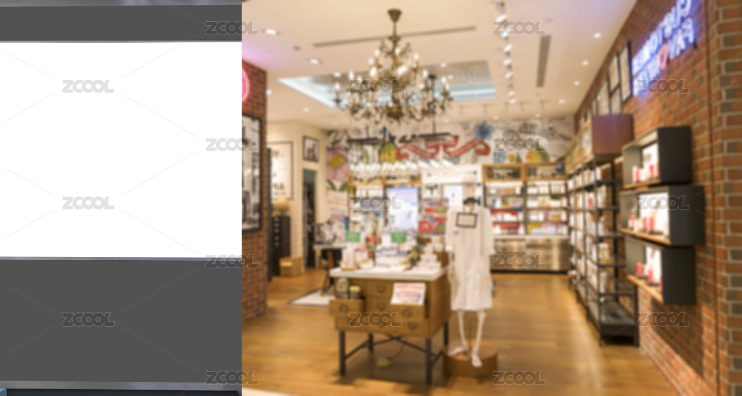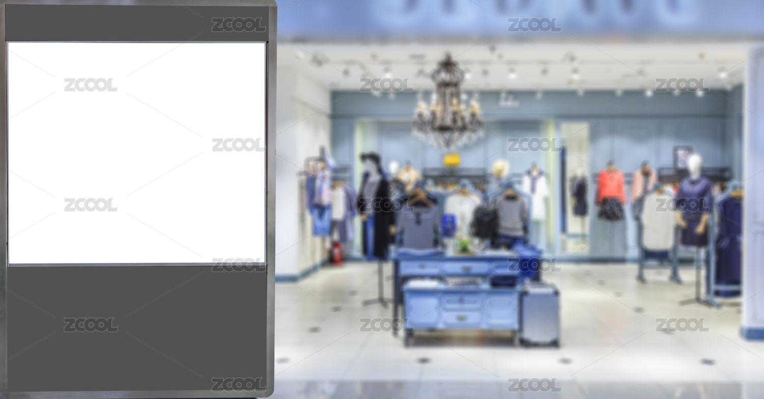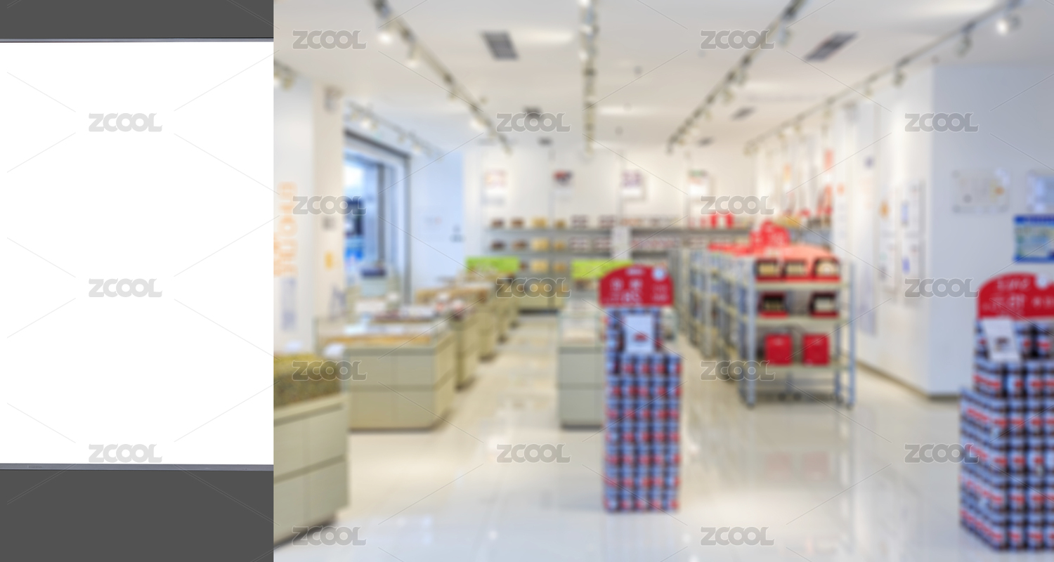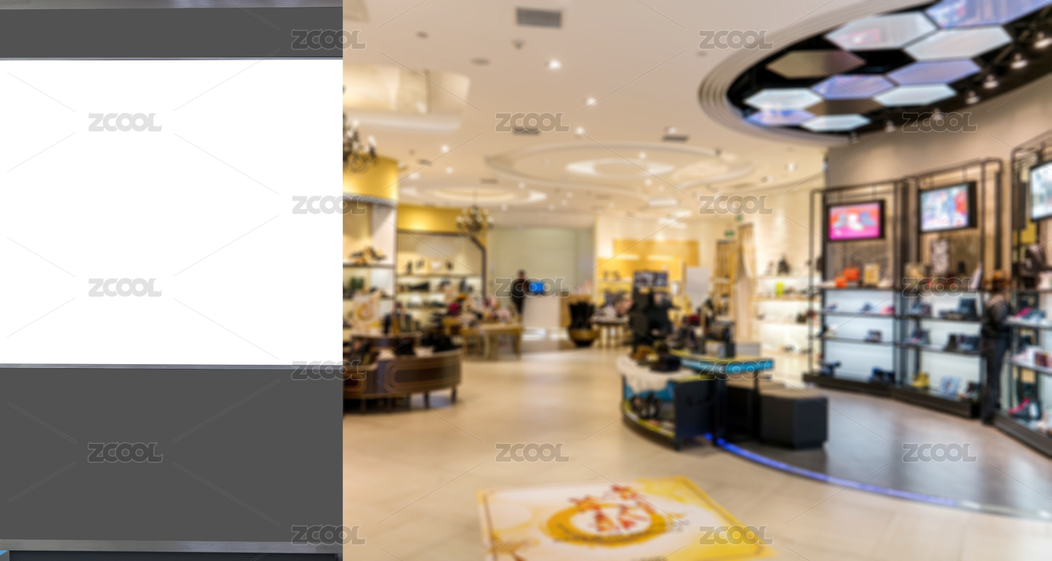 模糊的店鋪內(nèi)景和空白燈箱廣告