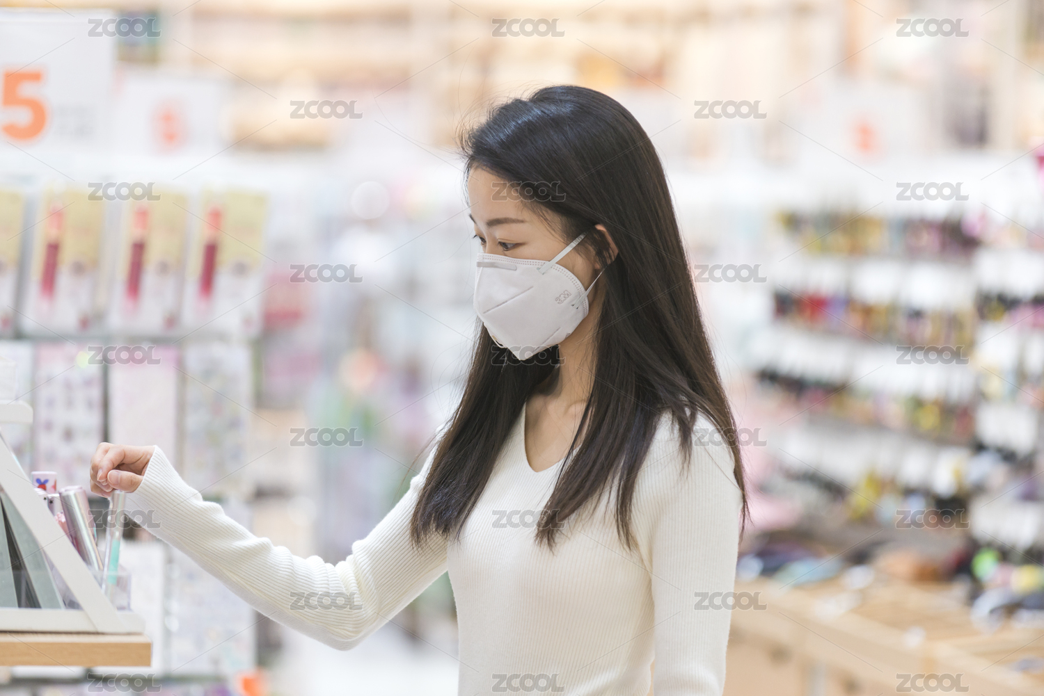 室內(nèi)雙手戴口罩的長(zhǎng)發(fā)女孩