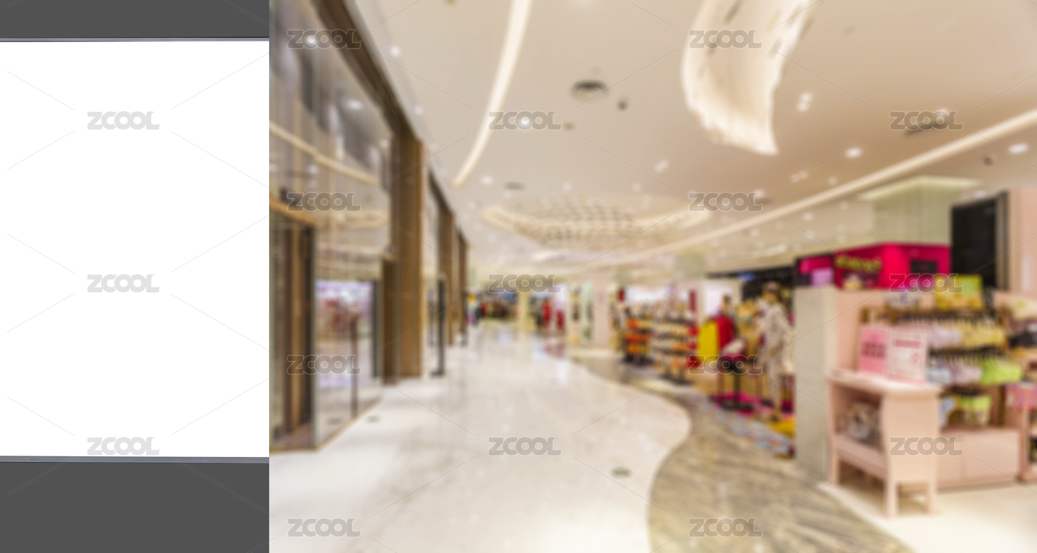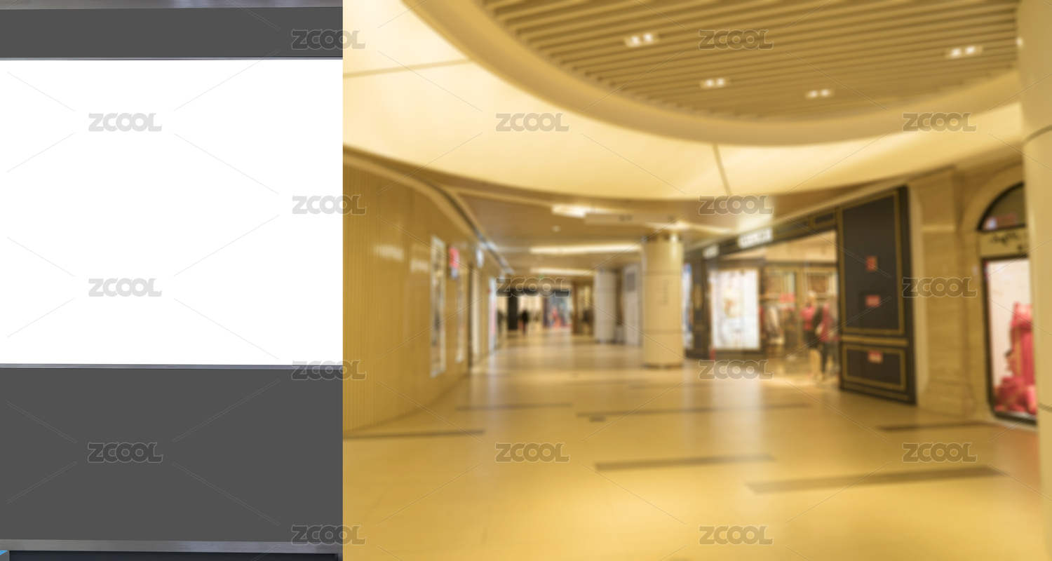 模糊的購(gòu)物中心店鋪內(nèi)景和空白的燈箱廣告