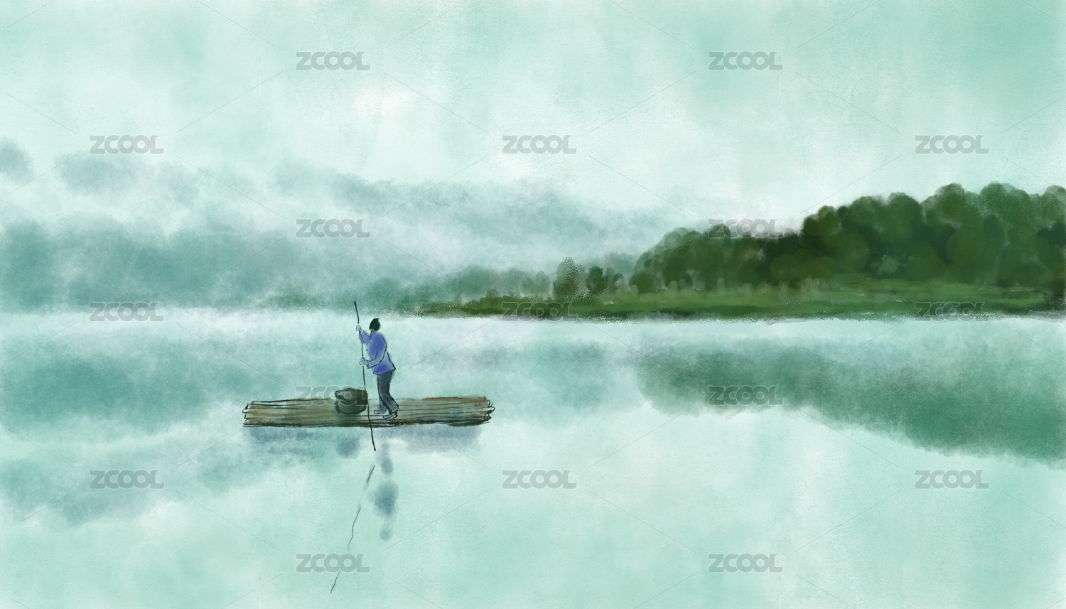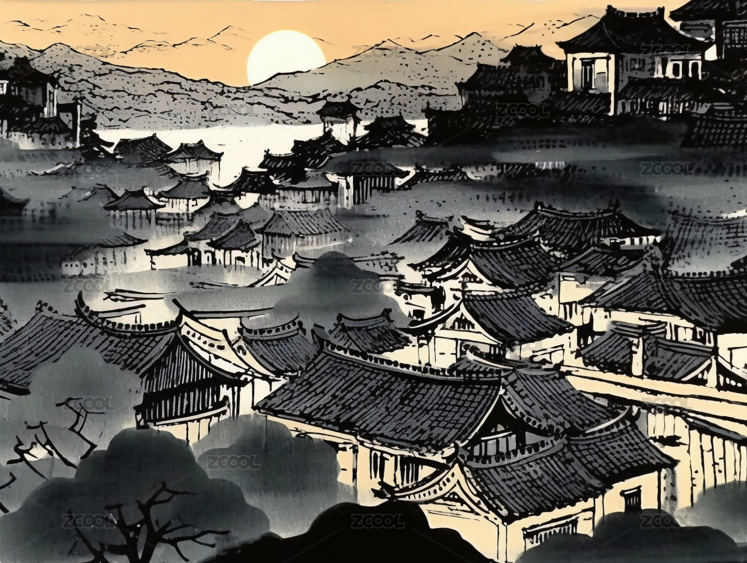 手繪中國風(fēng)江南水墨山水風(fēng)景畫