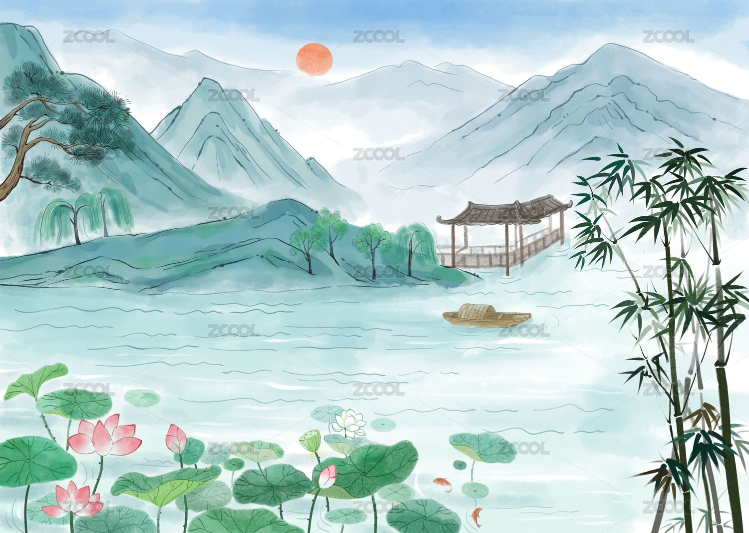 彩色國風(fēng)水墨山水畫水彩風(fēng)景畫